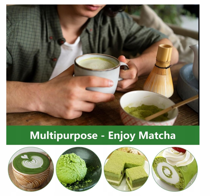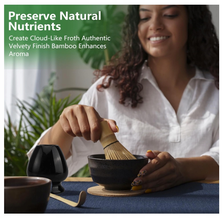- Єдиний дизайн роду містить бамбукову мітлу ручної роботи, 2 чайні ложки для матчі та елегантна керамічна ручка - підставка. Підставка служить функціональним рішенням для зберігання та захищає мітлу від пошкоджень.