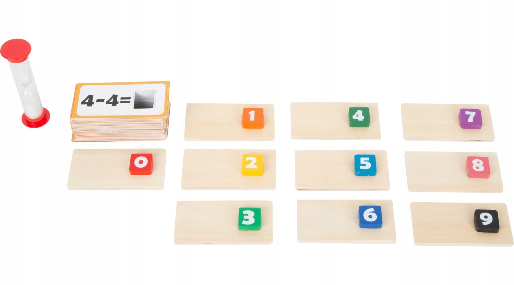 Практична коробка з висувним клапаном містить 121 елемент: картки з операціями додавання та віднімання в діапазоні від 0 до 9; Результатні елементи, а також пластиковий пісочний годинник. Картки з діями повинні бути приписані правильному результату, підрахованому дитиною. На картці є квадратний отвір, який ми розміщуємо на квадраті з результатом.