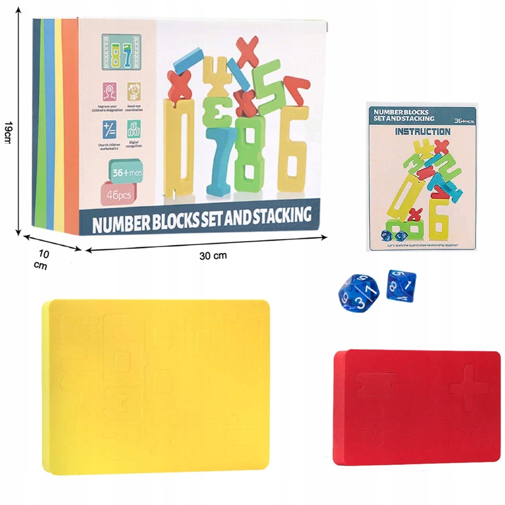 3 цифрові блоки різних кольорів (синій, жовтий, зелений), 1 червоний блок символів (додавання, віднімання, множення, ділення, більше або менше) , всього 46 штук. Дві десятигранні кубики, переносна сумка для зберігання та інструкція з експлуатації.