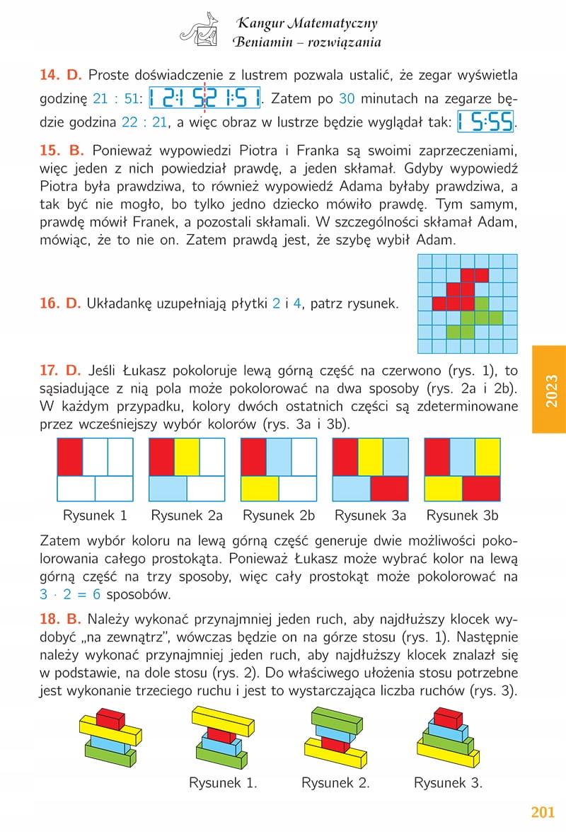 тестів "математичного кенгуру" міжнародної конкуренції з рішеннями, починаючи з 1993 року для вікового рівня "Бенджаміна" (класи 5 та 6 початкових класів). Абсолютно нова, цікава та барвиста композиція. Тести на конкуренцію для інших рівнів можна знайти в наступних обсягах серії "Математика з веселим кенгуру". Ця книга є наступником так -зведеного "жовтого" кенгуру, який з 2015 року був розділений на дві книги - окремого малюка та Бенджаміна на рівень. У книзі ви знайдете:
