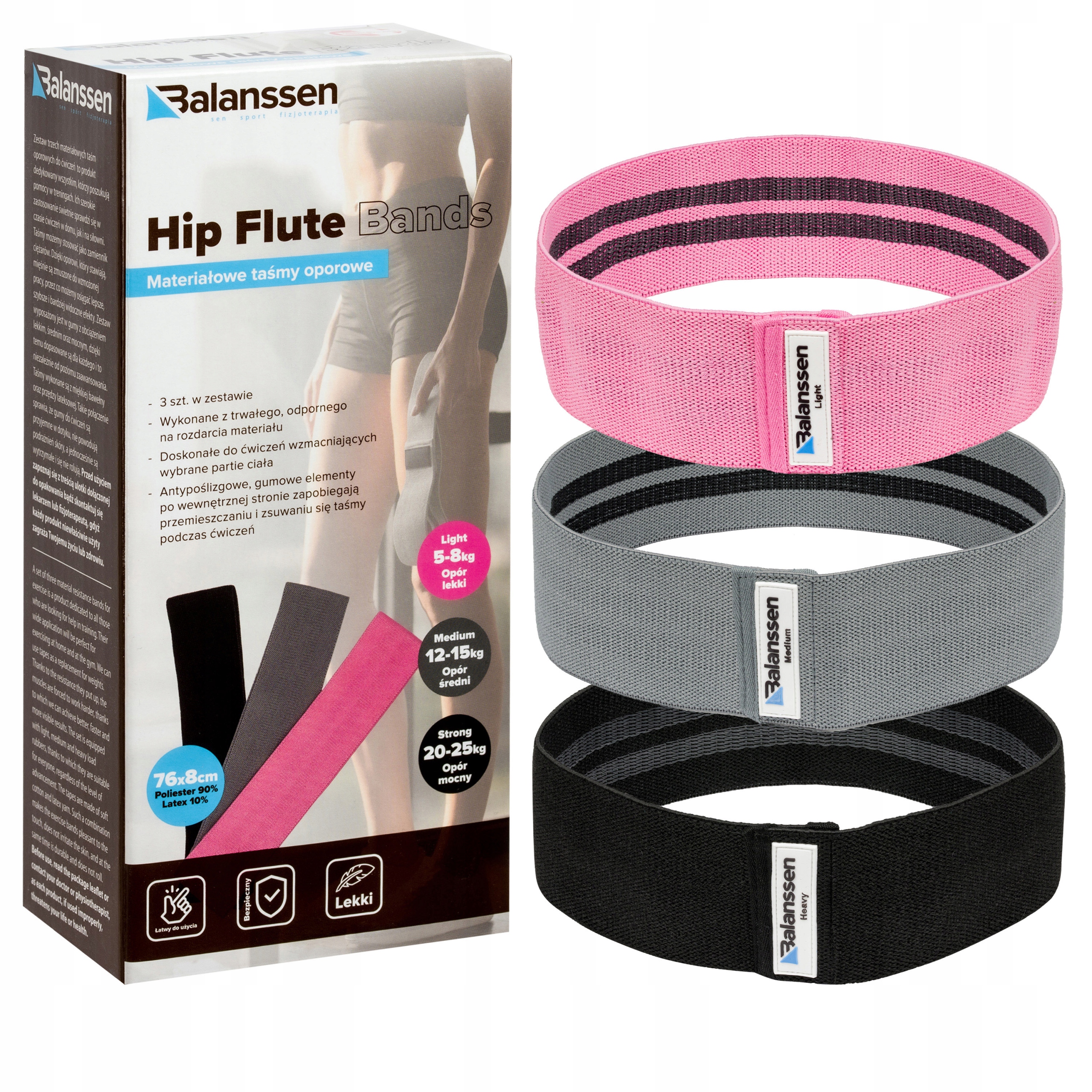HIP BANDY BALANSSEN - тканинні тренувальні стрічки круглої форми. Використовуються як у спорті, так і в реабілітації. Їх специфічна форма забезпечує універсальність використання. Завдяки тому, що стрічки виготовлені з гнучкого та міцного латексу та оточені матеріалом, вам не доведеться турбуватися про умови тренування під час занять - стрічки BALANSSEN дуже стійкі до постійної деформації.