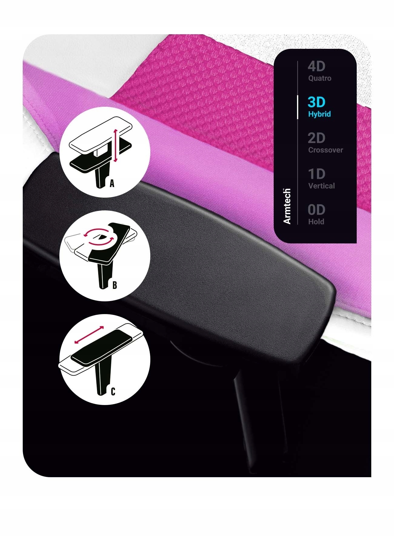 Armtech ™ Hybrid Підлокітники SoftTouch регулюються аж у трьох площинах, а правильна установка відповідає за зручне і стабільне положення і підтримку плечей, передпліч і зап'ясть. Їхня верхня частина додатково покрита піною, щоб ви могли м’яко та комфортно відпочивати руками.