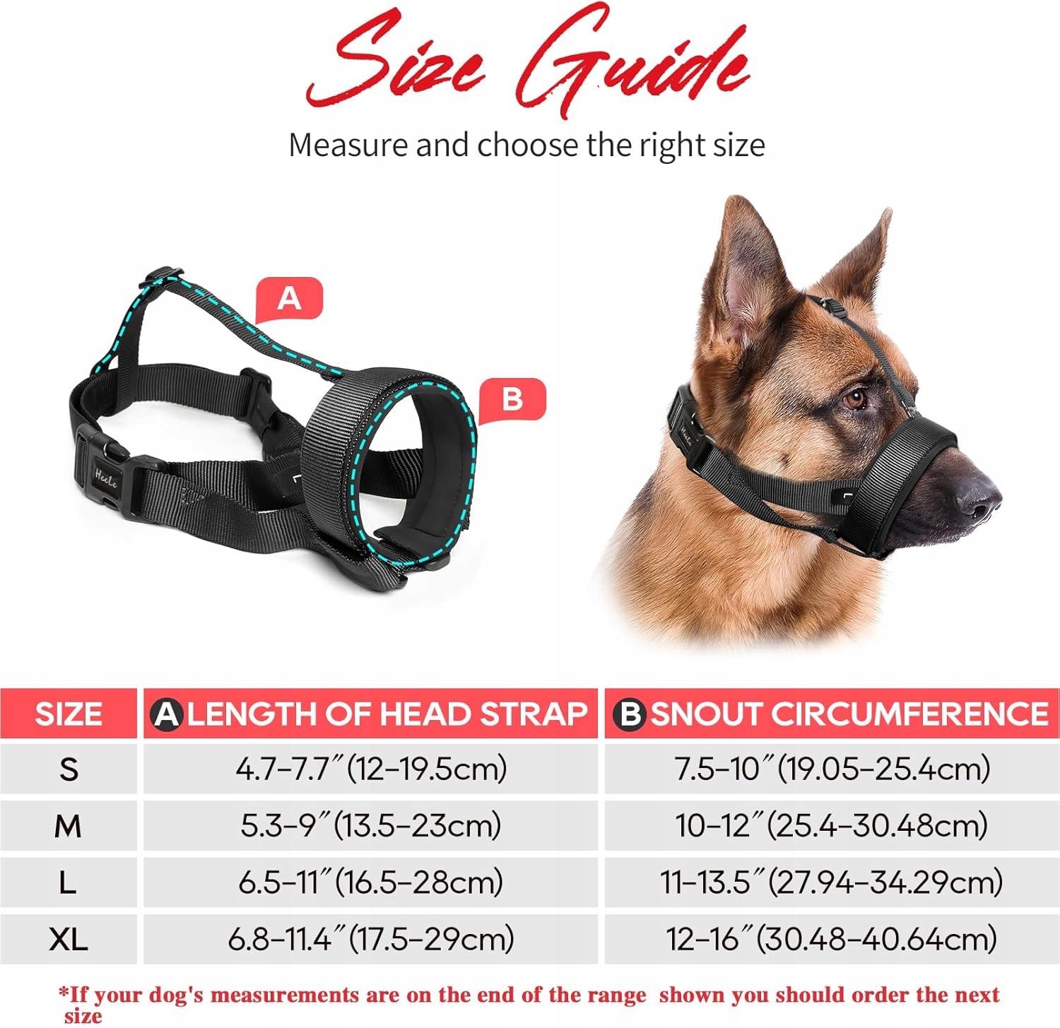 - Розміри: будь ласка! Ознайомтеся з ілюстрацією та виберіть потрібний розмір, вимірюючи окружність рота та шиї собаки. Якщо розміри вашої собаки схожі на максимальний розмір, виберіть наступний більший розмір.