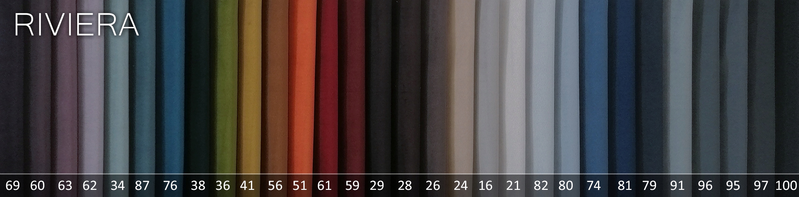 РІВ'ЄРА – щільна оксамитова тканина. Доступний в декількох кольорах. Особливості тканини: надзвичайно м'яка, оксамитова на дотик. Переваги: дуже хороша стійкість до стирання. Застосування: ідеально підходить для використання на меблях, декораціях і шторах.