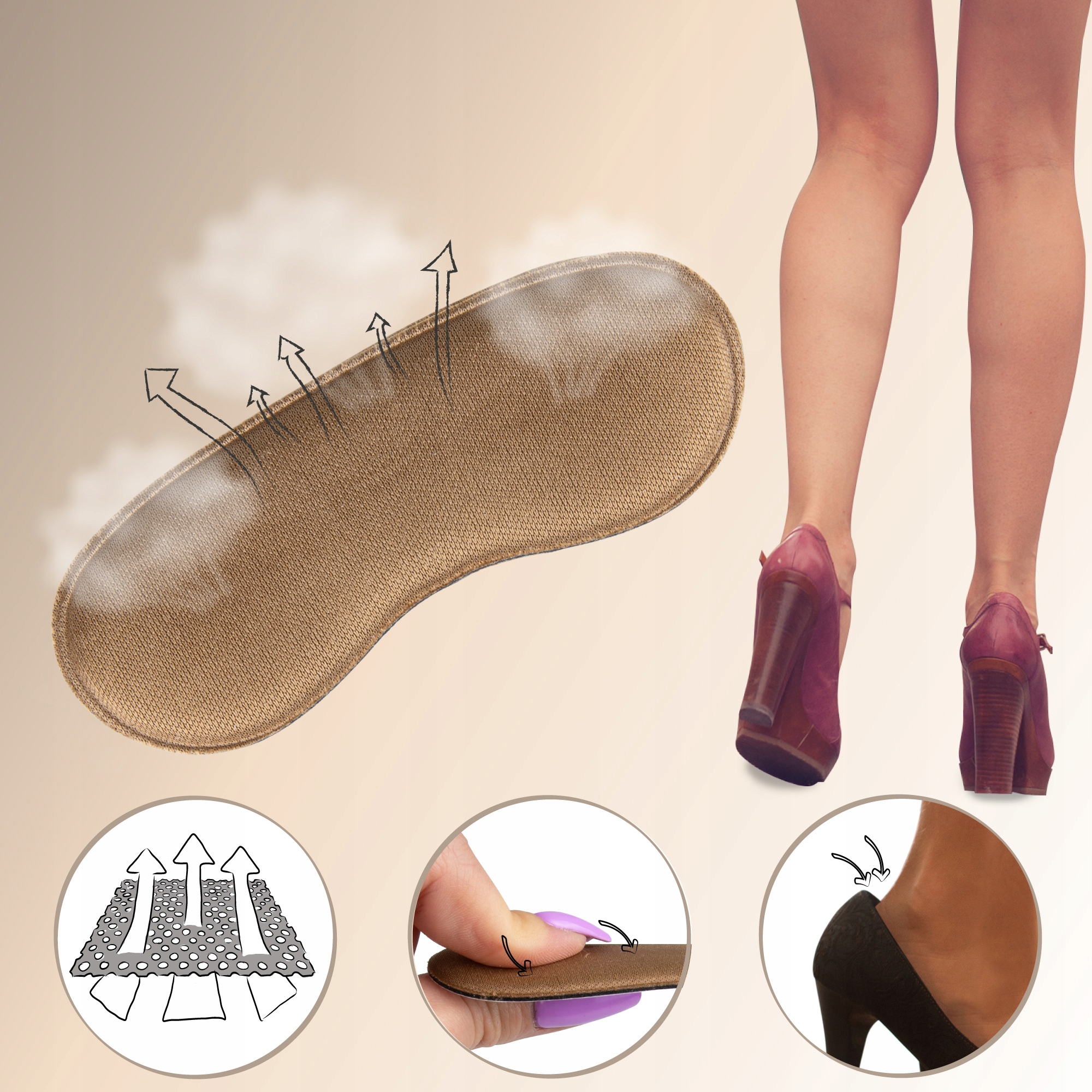 Вони допомагають зменшити розмір взуття та усунути розхитаність у взутті. Вони запобігають натиранню п'яти. У них одна сторона покрита клеєм, тому вони не рухаються у взутті під час ходьби, просто зірвіть захисну плівку та покладіть її на задню частину черевика.