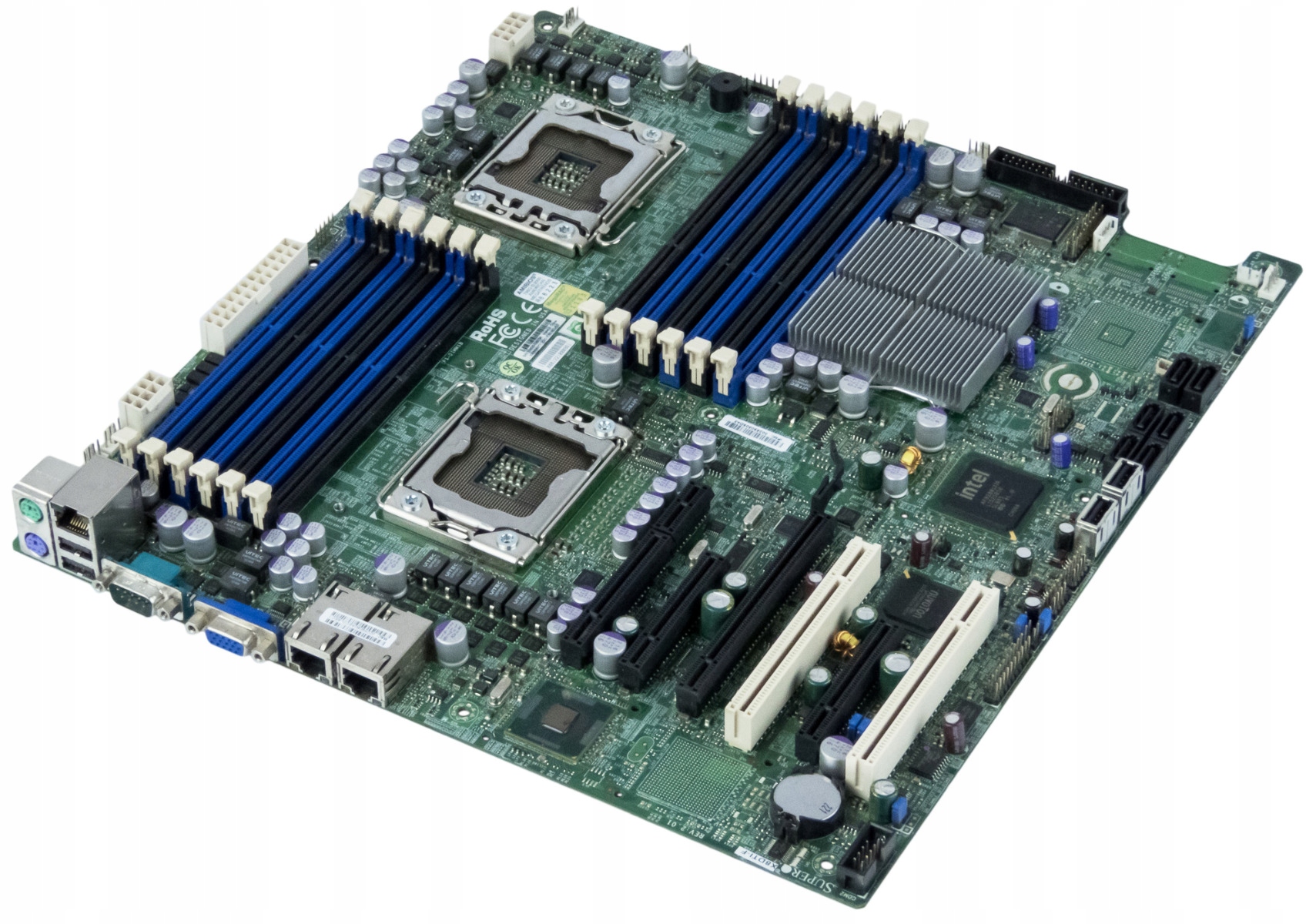 - Внутрішні слоти розширення: 1x PCIe 2.0 x16, 2x PCIe 2.0 x8, 1x PCIe x4, 2x PCI, 6x SATA II