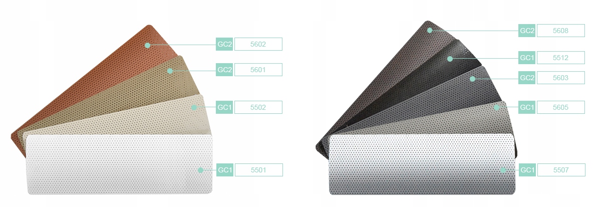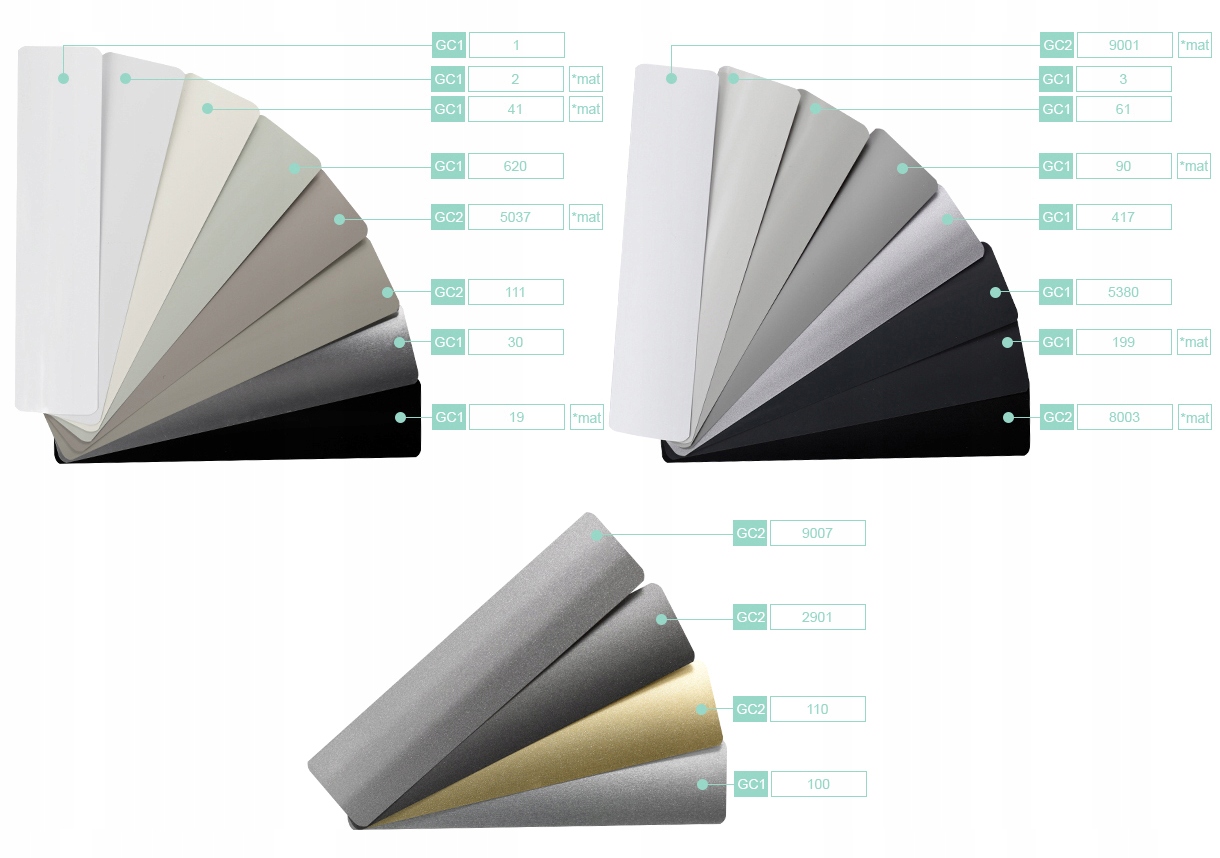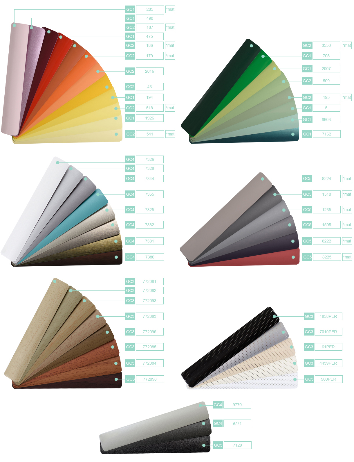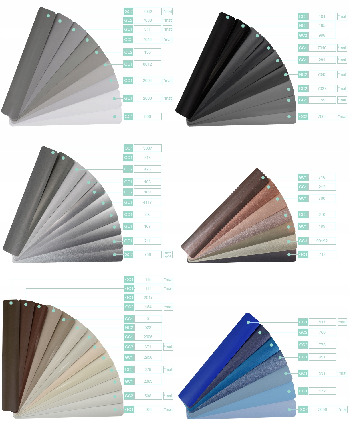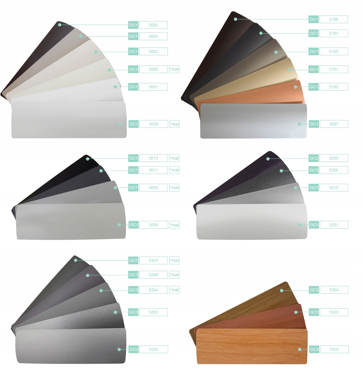 Алюмінієві жалюзі доступні в чотирьох розмірах: 16 мм, 25 мм, 35 мм і 50 мм. Кольори доступні в різних цінових групах (GC1 - найдешевший GC5 - найдорожчий).