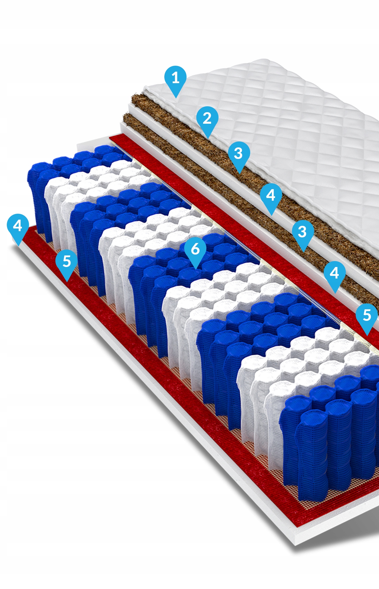Це натуральна, екологічна сировина, отримана зі шкаралупи кокосових горіхів. Кокосові волокна легкі і повітряні, а також дуже міцні і гнучкі, стійкі до вологи і деформації. Вони покращують циркуляцію повітря всередині матраца, запобігаючи надмірному потовиділенню. Кокос також має протиалергічні властивості та запобігає розвитку грибків і кліщів.