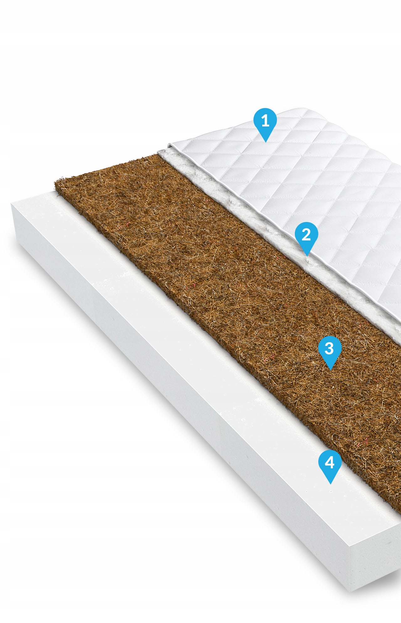 Це натуральна, екологічна сировина, отримана зі шкаралупи кокосових горіхів. Кокосові волокна легкі і повітряні, а також дуже міцні і гнучкі, стійкі до вологи і деформації. Вони покращують циркуляцію повітря всередині матраца, запобігаючи надмірне потовиділення. Також кокос має протиалергічні властивості, перешкоджає розвитку грибків і кліщів.