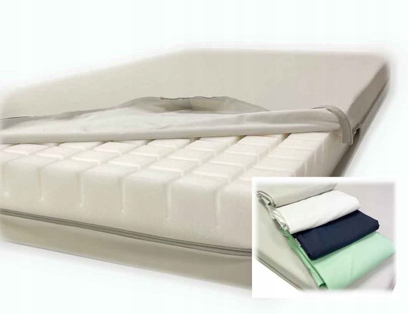 Матрац з пінопласту з білої лінії виготовлений із сертифікованої поліуретанової піни N2538 у водонепроникній кришці (поліестерна тканина, покрита поліуретаном). Це продукт багаторазового використання. Запобігає виразці тиску в місцях, що піддаються тиску. Дизайн матраца у вигляді вирізів у формі вафлі забезпечує хорошу вентиляцію між матрацом та поверхнею тіла пацієнта. Спеціальний матрац -профіль покращує кровообіг.