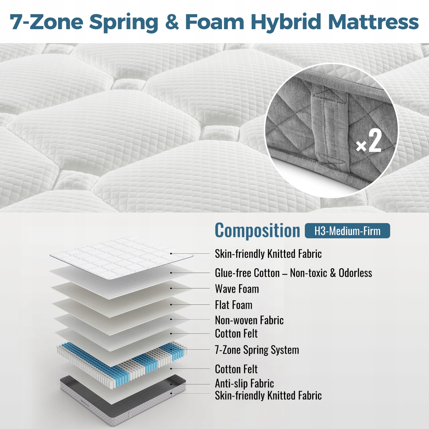 【Ергономічна 7-зонна ортопедична підтримка】7-зонна технологія Pocket Spring точно адаптується до форми тіла, забезпечуючи цілеспрямовану підтримку шиї, плечей, поперекового відділу хребта, тазу та ніг. Цей матрац середньої жорсткості (H3) ідеально підходить для підтримки вашої спини та забезпечення справді спокійного сну.
