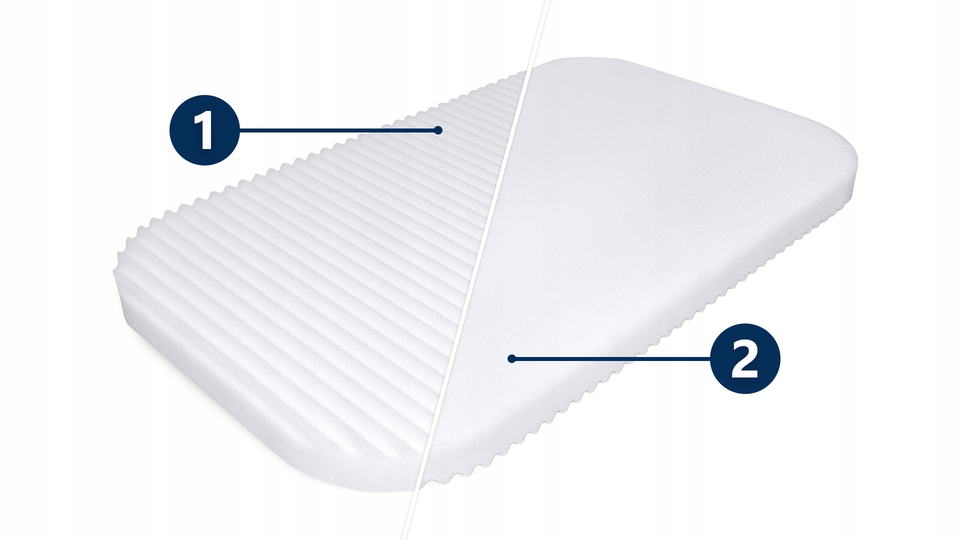 1️⃣Хвилеподібний профіль, врізаний у піну з одного боку матраца, пом'якшує її до твердості H2 (середньої жорсткості) та покращує вентиляцію забезпеченняменше потудля користувача