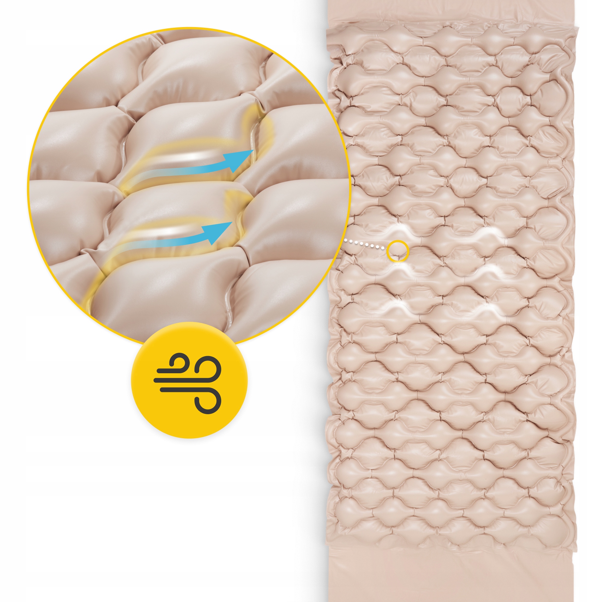 Принцип роботи матраца заснований на поперемінному надуванні та спорожненні окремих камер, які піднімаються і опускаються по черзі. Цей прийом забезпечує лежачій людині рух, який стимулює тканини. Завдяки цьому запобігає постійному тиску шкіри в одних і тих же місцях. Цей тиск може перешкоджати правильному кровотоку та лімфі, що призводить до розвитку хворобливих пролежнів. Постійний підйом і опускання камер також забезпечує кращу циркуляцію повітряміж матрацом і тілом людини, що лежить на ньому. Це запобігає надмірному потовиділенню тіла та допомагає підтримувати гігієну.