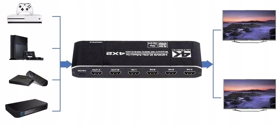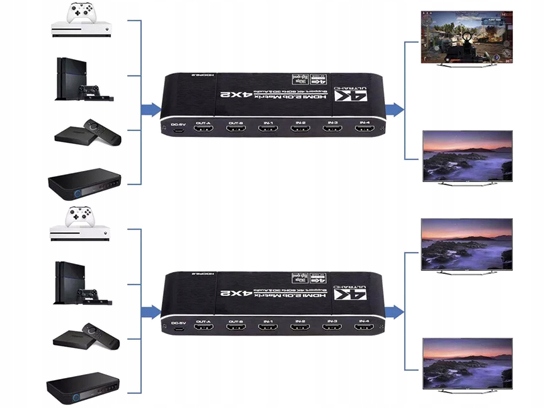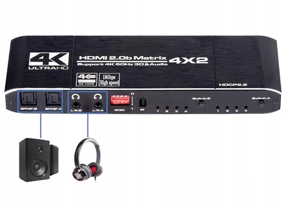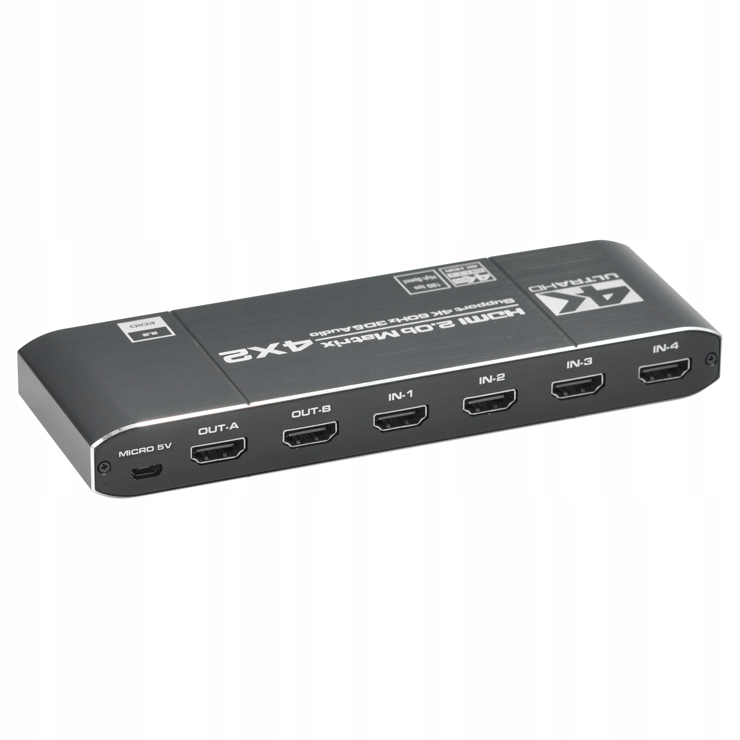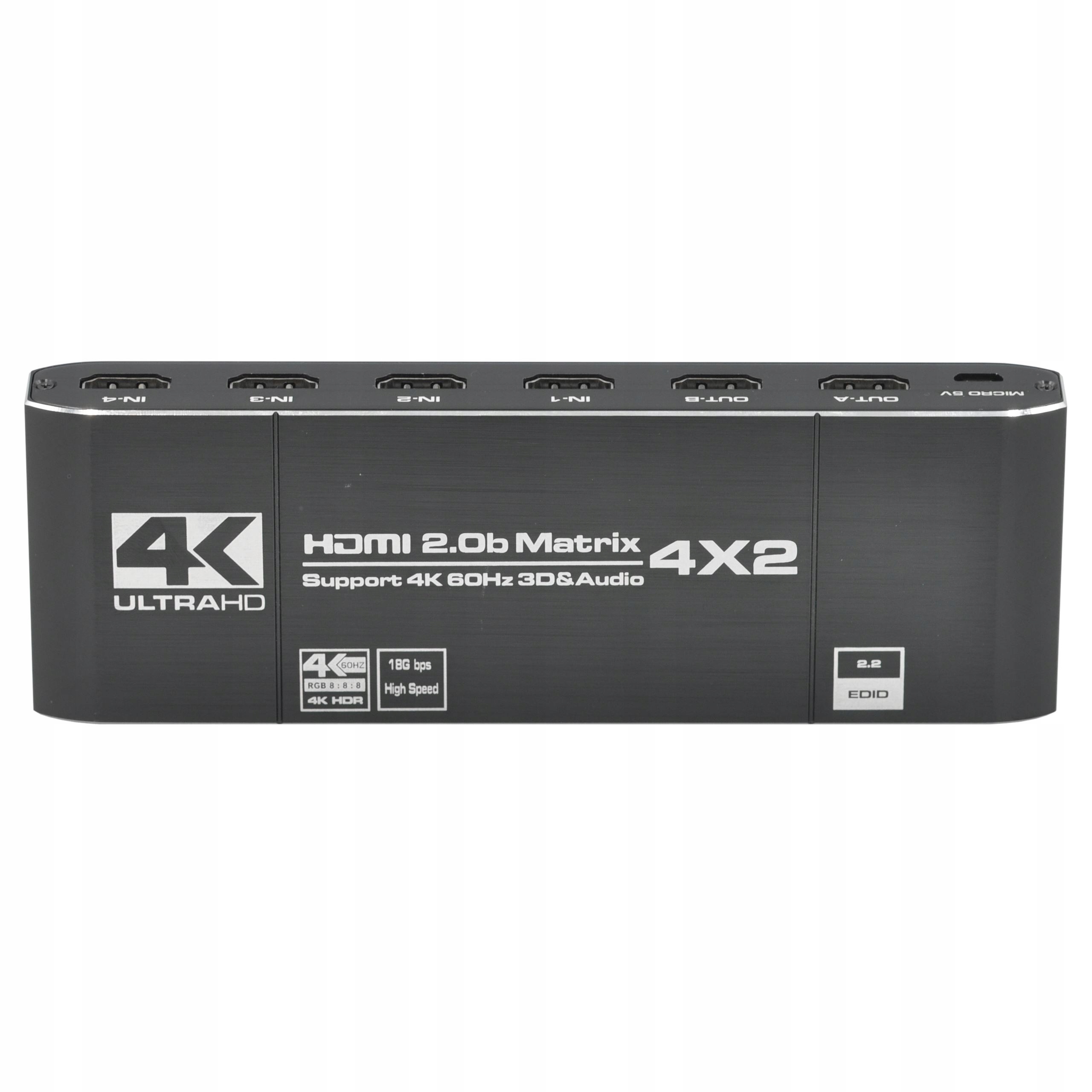 Matrix HDMI 4x2 забезпечує без втрат підключення 4 різних джерел сигналу 4K/60 Гц через HDMI до двох дисплеїв із портом HDMI одночасно передача аудіосигналу через цифровий роз'єм SPDIF або роз'єм для навушників 3,5 мм.