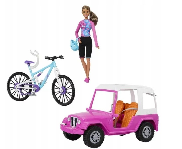 Цей спортивний набір також включає рожевий автомобіль Барбі, гірський велосипед та багажник для велосипедів, прикріплених до задньої частини транспортного засобу.
