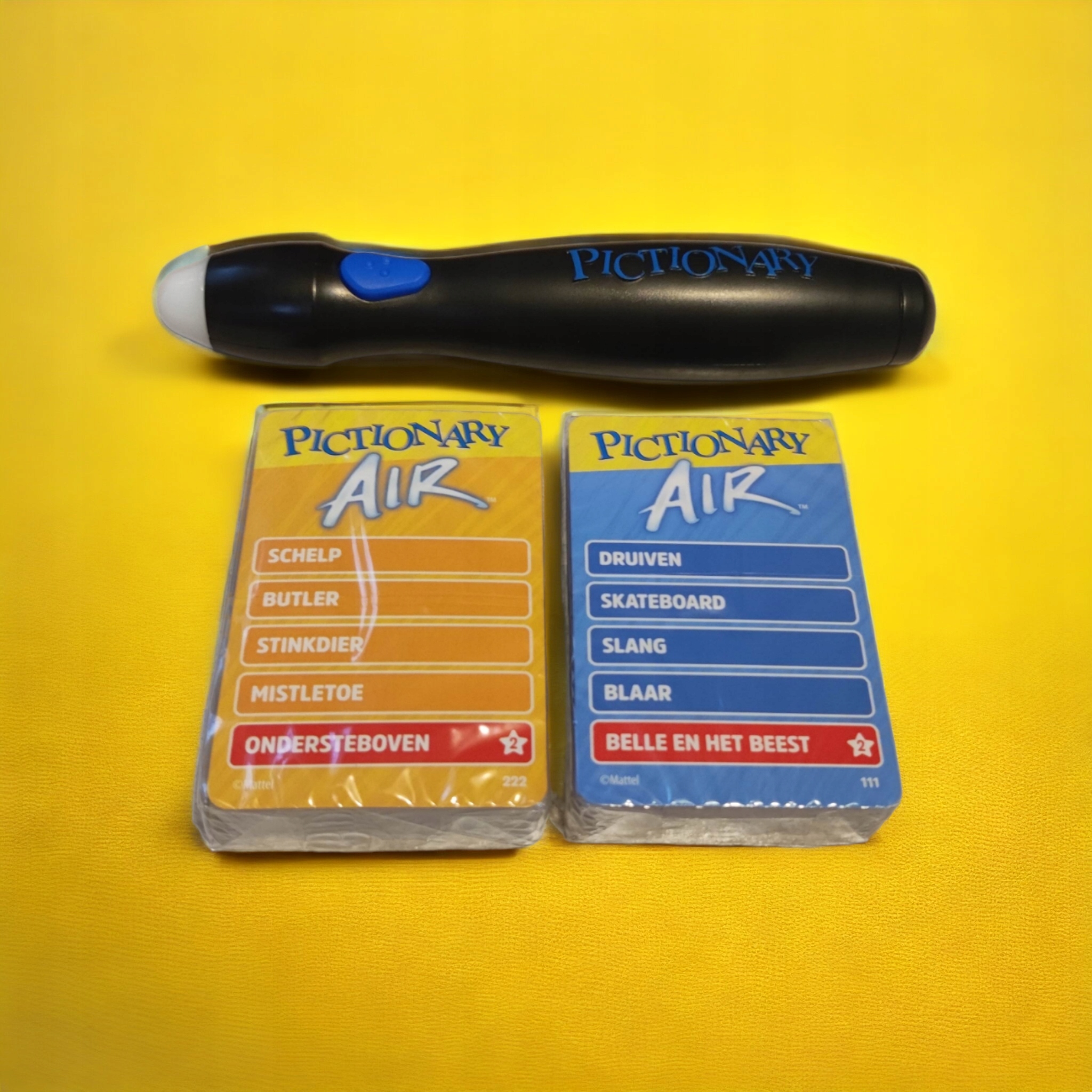 - Pictionary Air — це гра для будь-якої вечірки чи вечора для геймерів віком від 8 років. Включає ручку Pictionary Air, 112 двосторонніх карток із підказками та коробку для карток