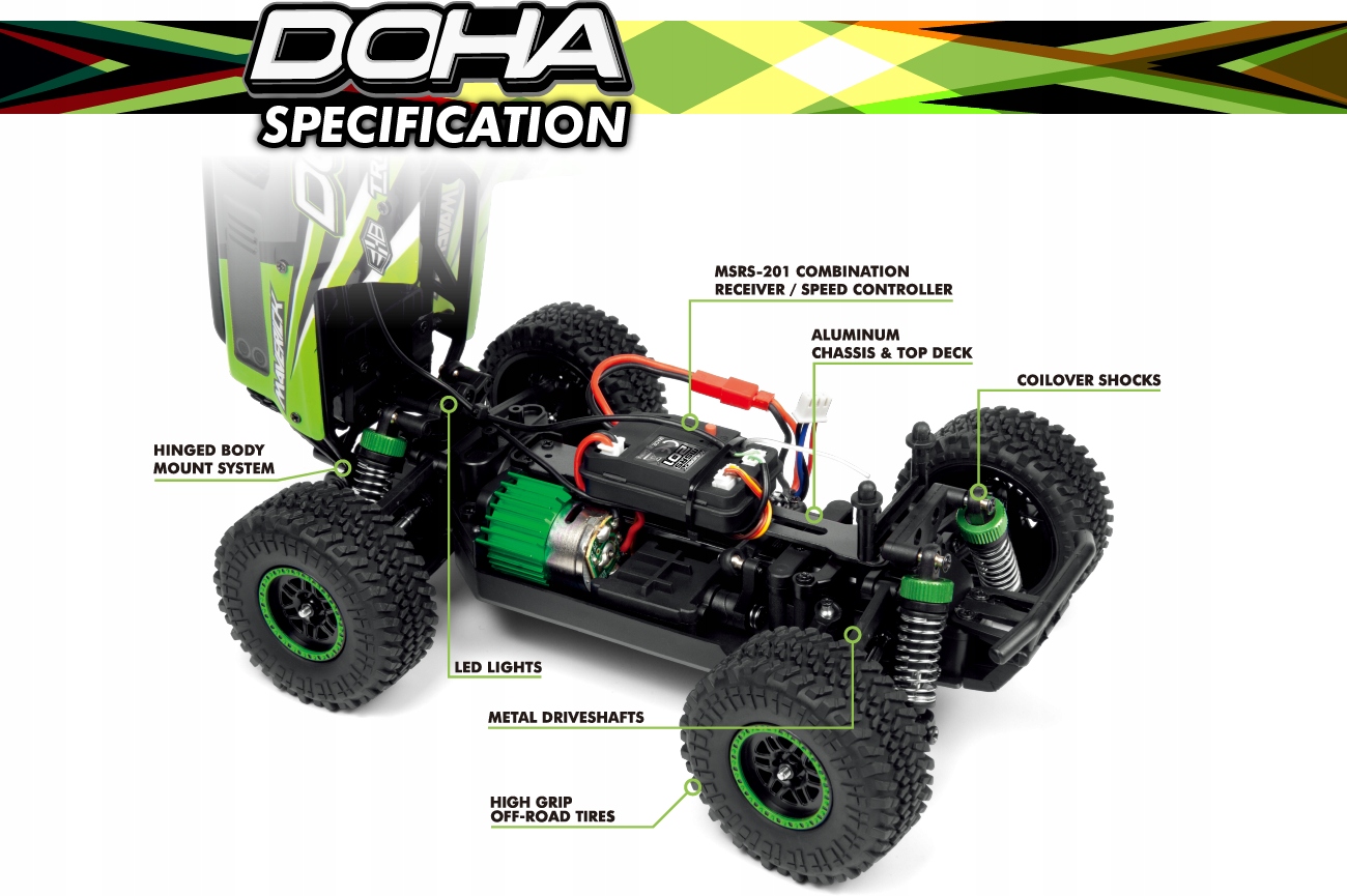 Набір Doha містить акумулятор Li-Ion 600mAh, практичний зарядний пристрій USB, радіосистеля MTX-201 2,4 ГГц та водонепроникний регулятор швидкості та освітлення та освітлення у версії 2-W-1. Крім того, модель була оснащена світлодіодними вогнями на клітці на даху, що дозволяє забавувати навіть після темряви.
