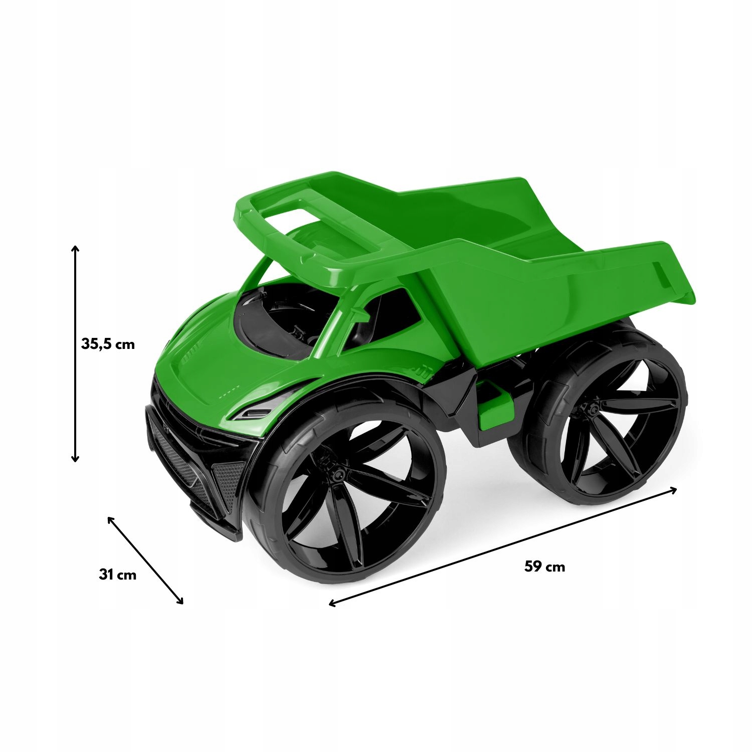MAXIMUS- це великий самоскид кольору соковито-зеленого, який вирізняється: сучасним дизайном, міцною, легкою конструкцією, сучасною лінією кузова з великими матовими колесами та красивими деталями обробки. Крім того, він має рухливу верхню частину, що відкривається, і зручну ручку, що дозволяє різноманітно і реалістично грати; його можна використовувати для транспортування піску або інших іграшок. Довжина автомобіля 59 см.