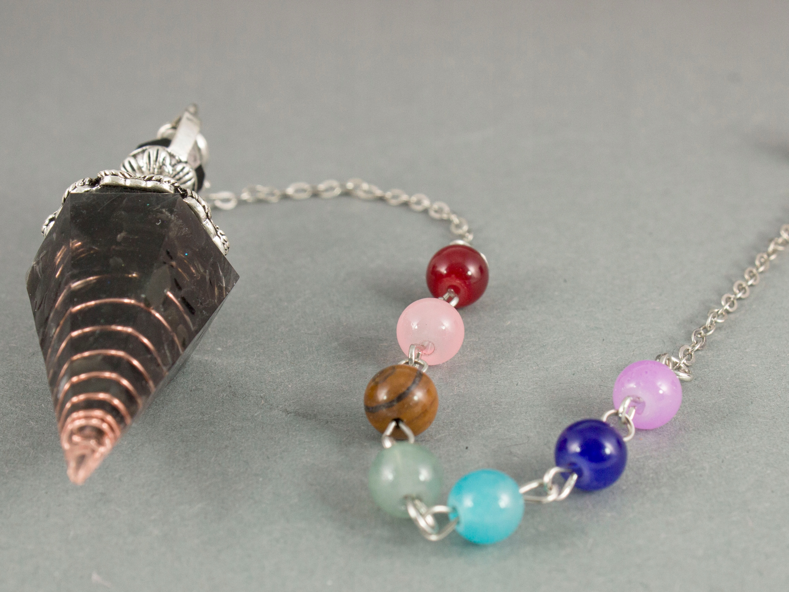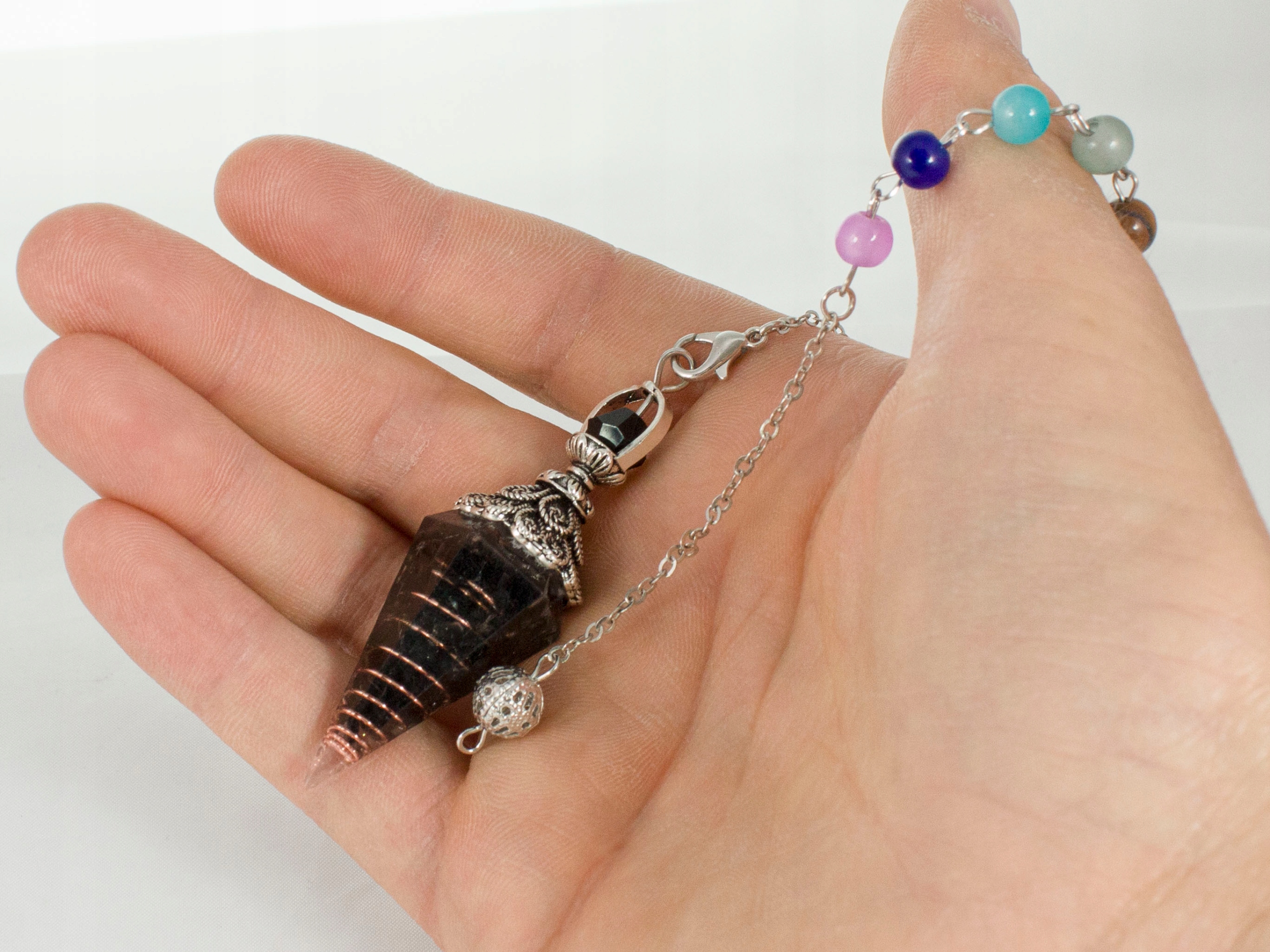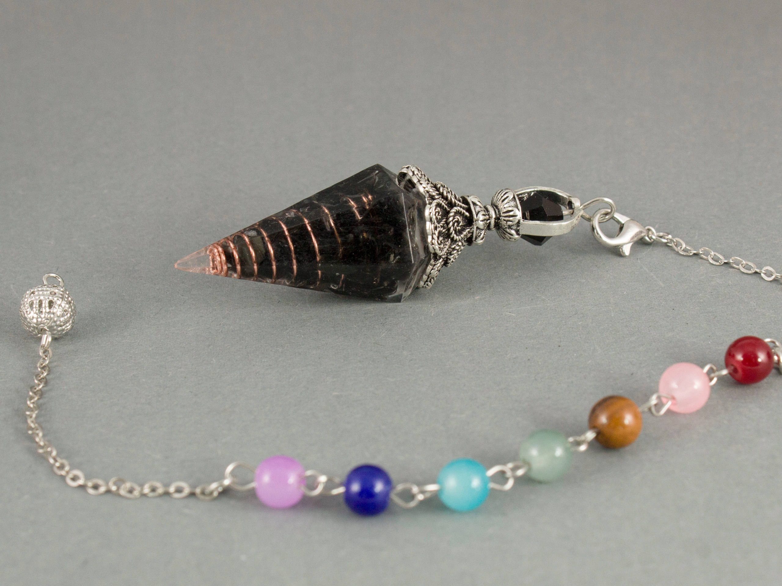 хірургія. Молочний човник. Його серце - це суміш обсидіана з тонко інтегрованим мідним дротом всередині, що зміцнює його енергетичні властивості. Маятник підвішений на елегантному ланцюзі, прикрашеному 7 барвистими намистинами, символізуючи 7 чакри, які прекрасно поєднуються з глибоким чорним обсидіаном. Маятник додає цілий тонкий, енергетичний акцент і зміцнює енергетичний ефект, що робить цей об'єкт не лише потужним інструментом для ворожіння, розміщення водних вен тощо, але й справжнього робочого мистецтва.