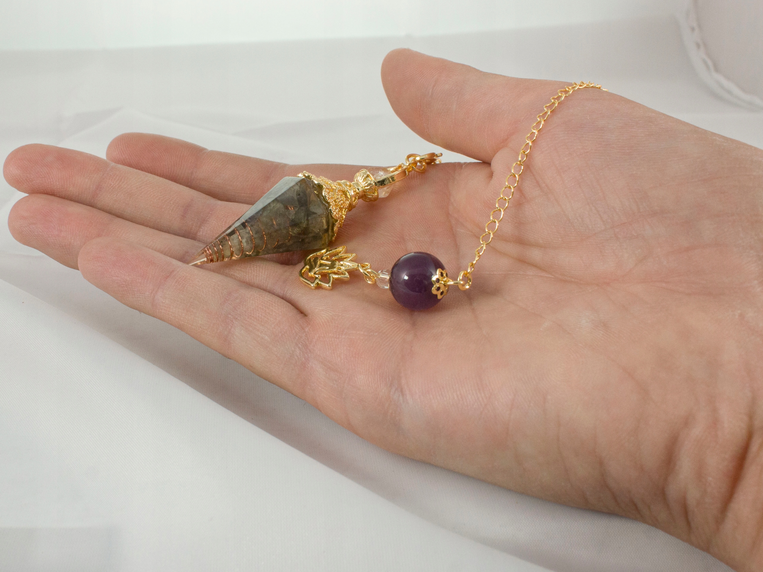Чудовий амулет, оргонітовий маятник із лабрадоритом і аметистовою кулькою на кінці ланцюжка з блискучими золотими ланками, що впливає на всі 7 чакр позитивною енергією.