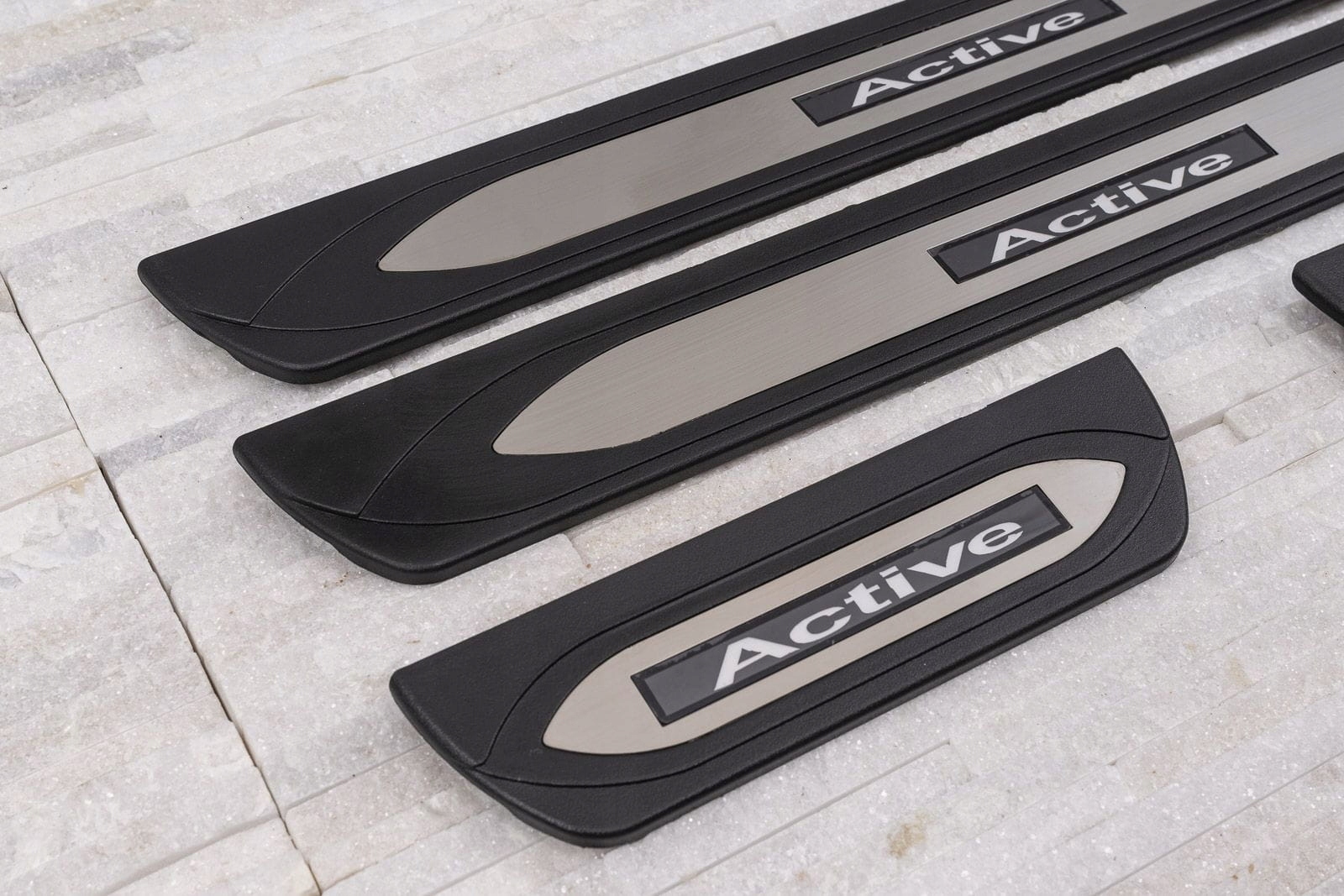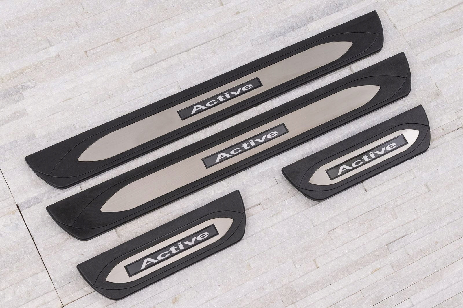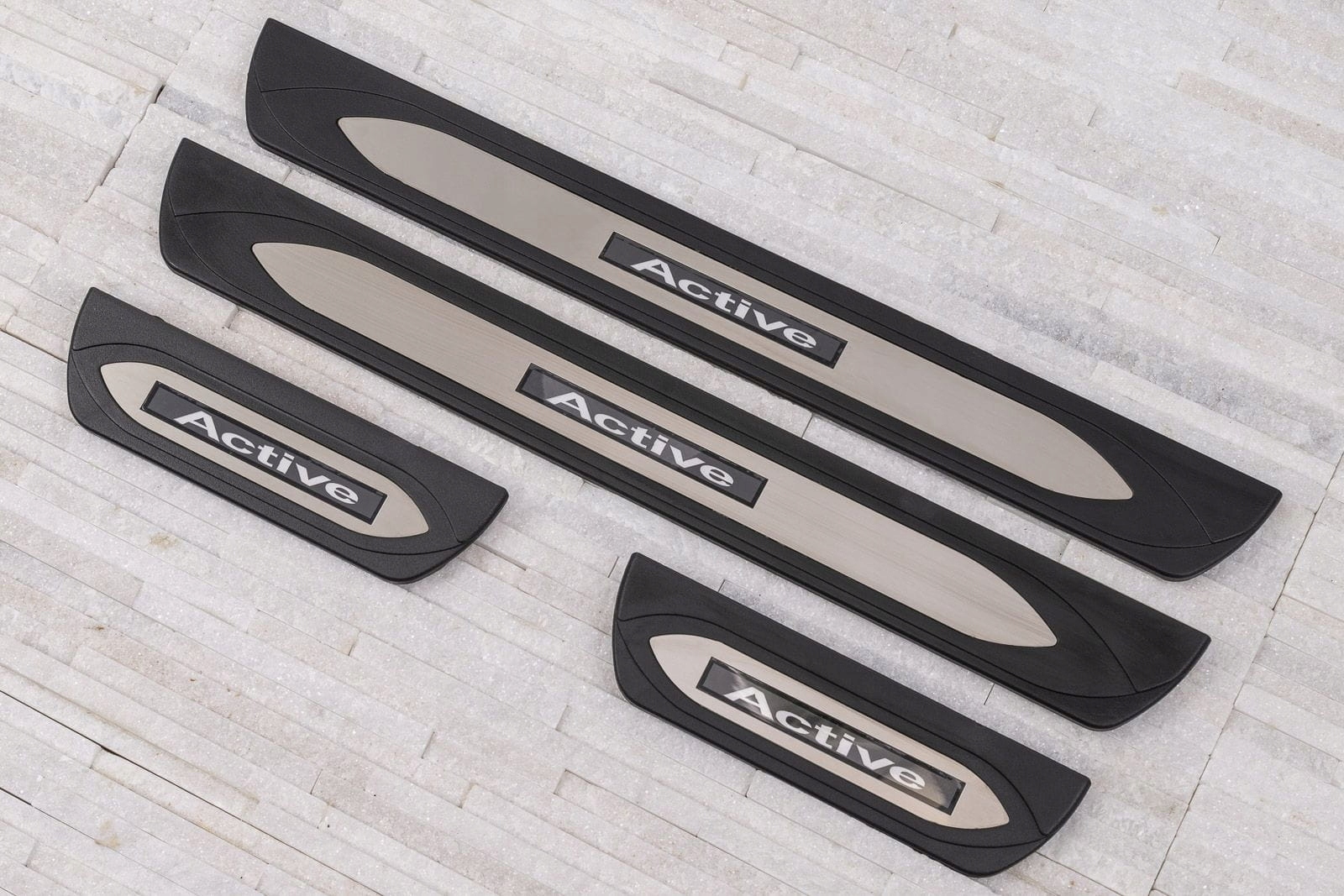 смужки встановлені на лакованих частинах внутрішніх порогів. Вони доповнюють внутрішню лінію дверей, надають області порогів спорт та елегантний вигляд. Ця модель привертає увагу декоративним, , освітленим активним написом . Завдяки побудованому світлодіодному освітленню елемент не тільки підкреслює сучасний стиль автомобіля, але й яскравіше навколо порогу, таким чином сприяючи сідати та виходу. Окрім цінностей укладання, планки відіграють захисну роль, захищаючи пороги від подряпин та пошкодження, які можуть виникнути при виїзді та виїзді з машини.