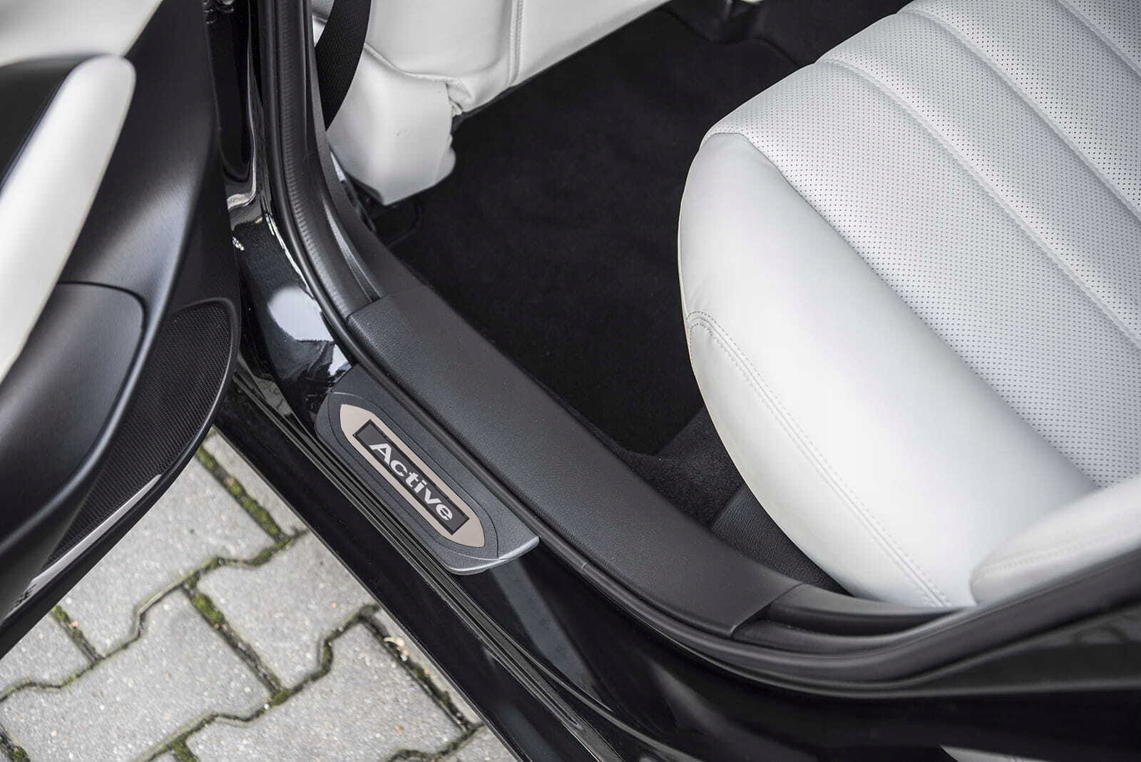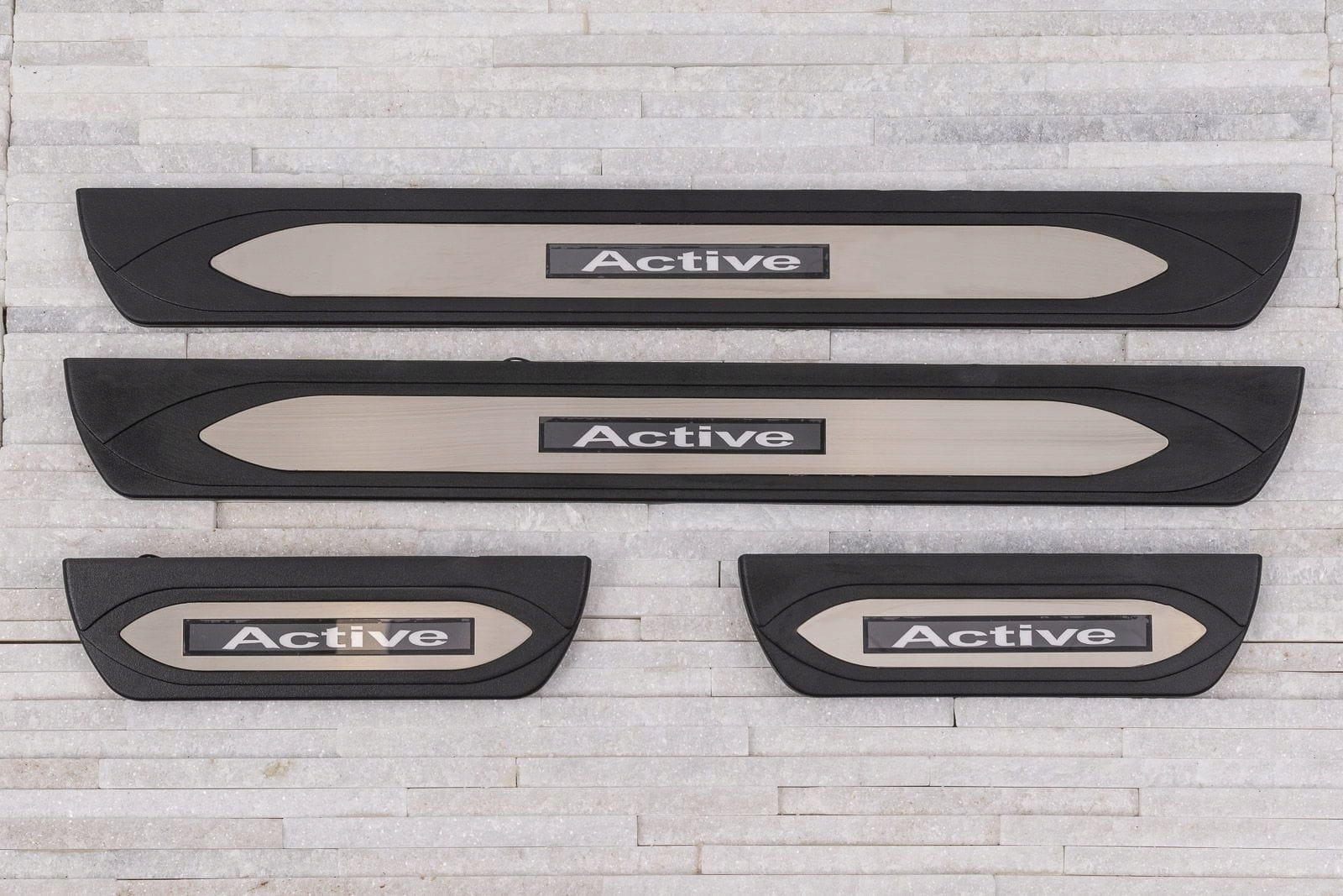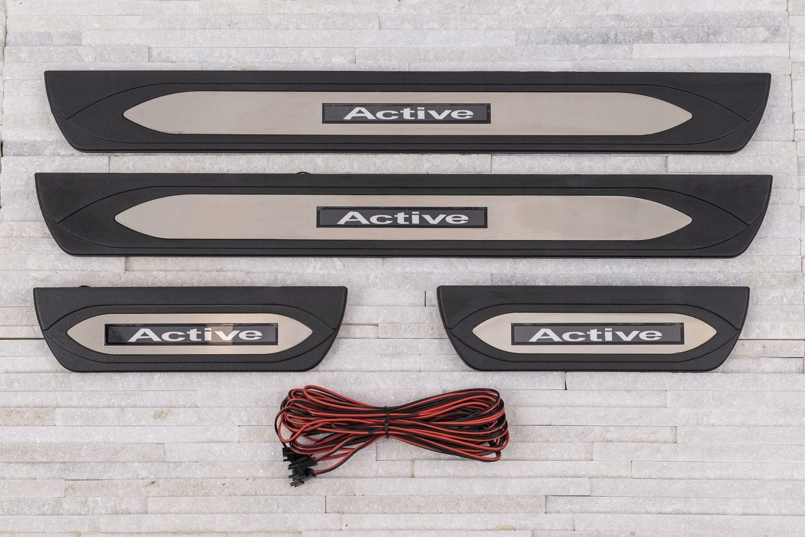 смужки встановлені на лакованих частинах внутрішніх порогів. Вони доповнюють внутрішню лінію дверей, надають області порогів спорт та елегантний вигляд. Ця модель привертає увагу декоративним, , освітленим активним написом . Завдяки побудованому світлодіодному освітленню елемент не тільки підкреслює сучасний стиль автомобіля, але й яскравіше навколо порогу, таким чином сприяючи сідати та виходу. Окрім цінностей укладання, планки відіграють захисну роль, захищаючи пороги від подряпин та пошкодження, які можуть виникнути при виїзді та виїзді з машини.