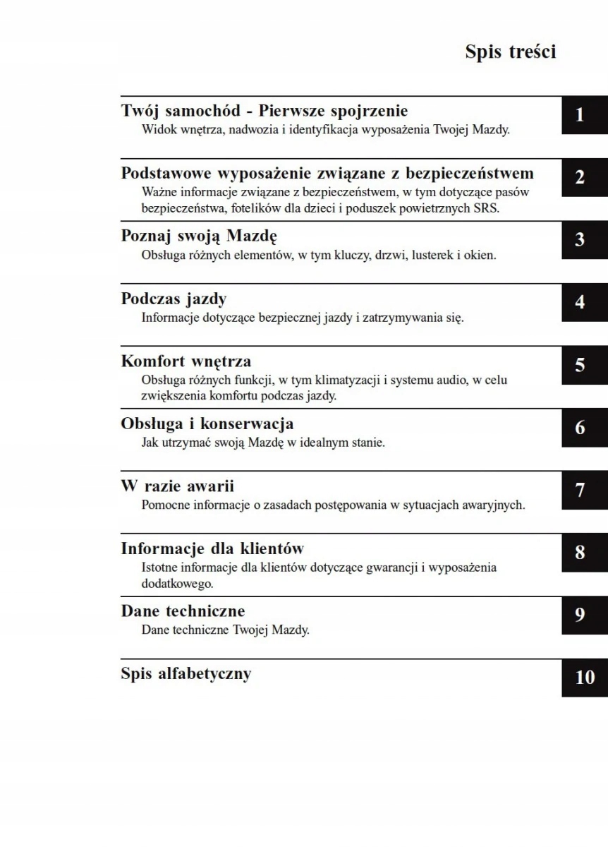 Посібник з експлуатації Mazda містить усі версії обладнання та корисну інформацію щодо ефективного та безпечного використання автомобіля, наприклад, індикатори, контрольні лампи, відкривання та закривання, освітлення та видимість, сидіння, відділення для речей, опалення, вентиляція, кондиціонування повітря - водіння, поради з експлуатації, технічне обслуговування автомобіля - рівень рідини, перевірка та заправка, аварійні операції, заміна коліс, запобіжників, заміна лампочок - технічні дані... та багато іншого, що дає відчуття безпеки та комфорту мандрівникам. Польське законодавство зобов’язує продавця додавати інструкцію з експлуатації автомобіля польською мовою. Посібник з експлуатації автомобіля новий і польською мовою.