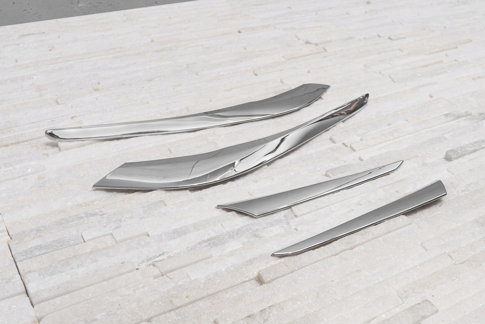 У набір входить набір із чотирьох планок для задніх ліхтарів. Виріб виготовлено з високоякісного хромованого ABS пластику. Вони кріпляться за допомогою двостороннього скотча Scotch 3M, наклеєного на внутрішню частину елементів. Рекомендуємо професійний монтаж.