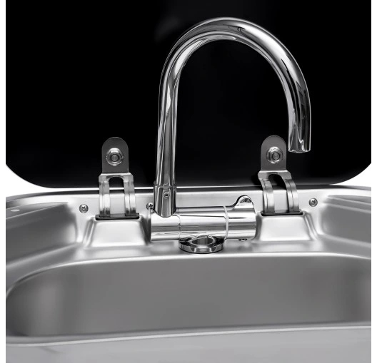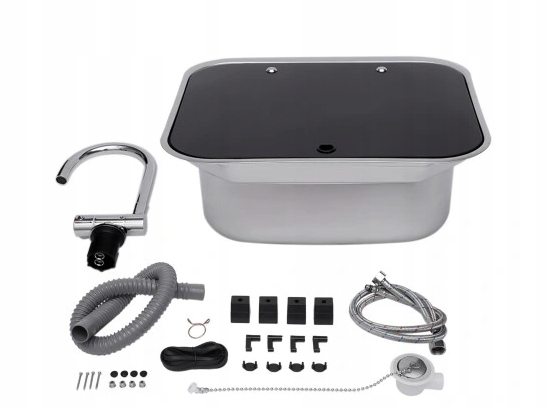 Це повний комплект раковини для автофургону зі змішувачем, раковиною, вхідною трубою, дренажною трубою та аксесуарами для встановлення. Цей набір раковин призначений для туристів з невеликим простором. Він компактний, але добре підходить для щоденного використання. Безпечний і міцний матеріал з нержавіючої сталі також прослужить довго. Крім того, раковина оснащена заслінкою і висувним краном, які економлять місце. Хоча він компактний, він цілком функціональний і є чудовим вибором для кемпера!