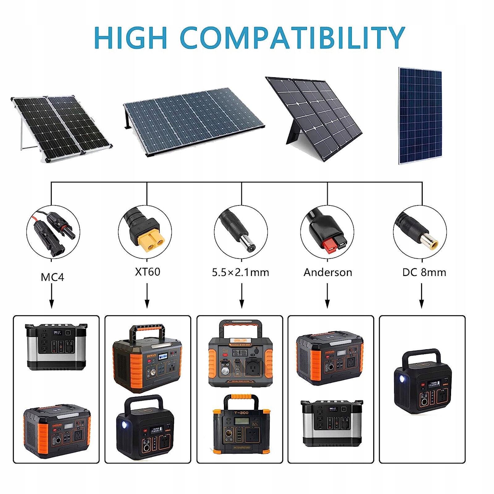 Кабель для сонячної панелі: забезпечує зручне рішення для всіх сонячних панелей із роз’ємами сонячної панелі, композитний кабель, що відповідає роз’єму сонячної панелі панель до кабелю XT60*1, кабель постійного струму 5,5x2,1 мм*1, кабель постійного струму 8 мм*1, сумісний кабель з роз’ємом Anderson*1