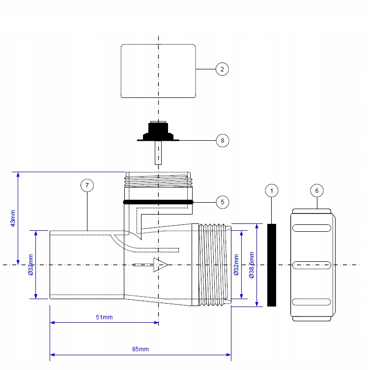 Фото позначено кріпильним кріпленням для кріплення для McAlpine V1ABSV-32-PL-CP. Напрямок потоку позначений стрілкою на тілі.