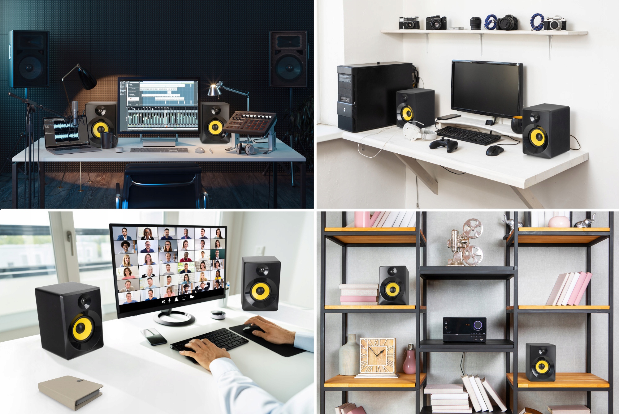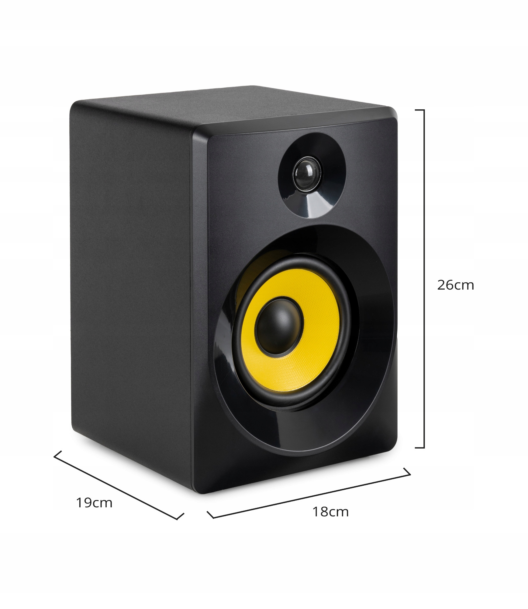 Дводіапазонні монітори для прослуховування з Bluetooth V 5.1 із вбудованим стереопідсилювачем 50 Вт RMS. Ідеально підходить для ігор, мультимедіа та невеликих студій. На задній панелі коробки є регулятори гучності, низьких і високих частот, а також перемикач увімкнення/вимкнення та індикатор Bluetooth. Чорного кольору з жовтими перетинками.
