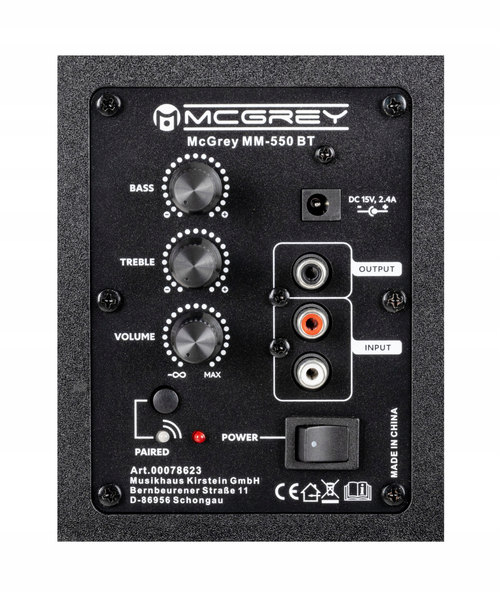 Елементи керування, розташовані на задній панелі, гучність, високі та низькі частоти надзвичайно спрощують тонке налаштування, тож ви завжди можете вибрати потрібний звук для вибраної програми. Окрім елементів керування на задній панелі, на задній панелі пристрою також є індикатор з’єднання Bluetooth, який повідомляє про стан з’єднання. Вбудований Bluetooth-приймач підтримує версію 5.1. Це робить McGrey MM-550BT ідеальним для використання на ПК, ноутбуці або консолі, планшеті, мобільному телефоні чи телевізорі, а також у студії для запису, прослуховування чи моніторингу. Загалом звук потужний і деталізований, із гучними басами та точними середніми й високими частотами. У комплект поставки завжди входить пара динаміків (master-slave), відповідний блок живлення та з’єднувальний кабель Cinch довжиною 1 м.