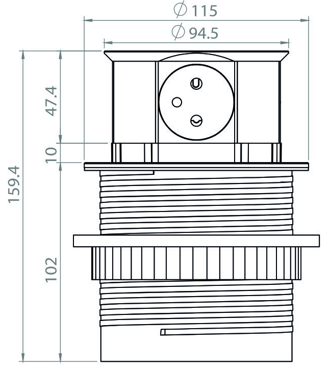 Набір із чотирьох розеток 250 В змінного струму/16 А із заземленням у корпусі, прихованому в стільниці. Пристрій призначений для установки в конференц-столи, стільниці офісних і кухонних меблів. Вимагає мінімум місця під стільницею, автоматично висуває панель з розетками при натисканні на кришку. Оснащений кабелем 1,5 м.