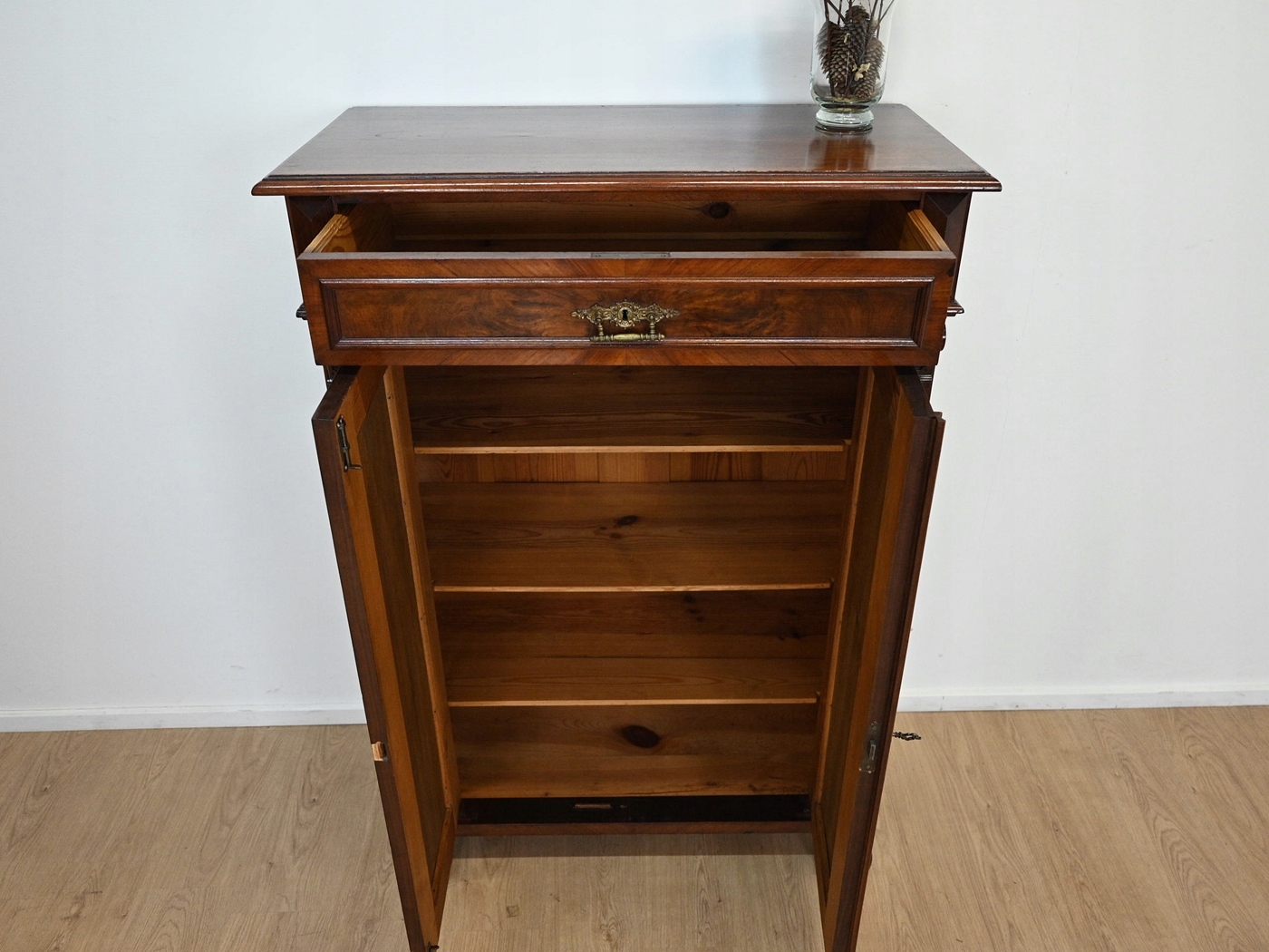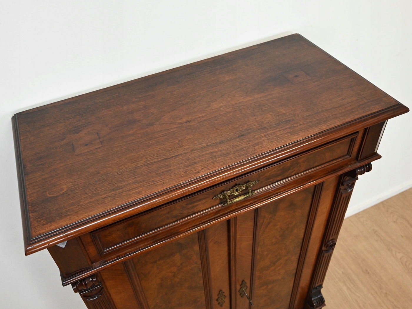 хороший стан. Меблі, підготовлені до використання. Зовнішні поверхні та центр меблів були оновлені. Меблі вже мають свої роки та сліди минулого часу, що не впливає на його естетичний прийом, вони є свідченням справжності меблів. Кабінет може негайно поставити в квартиру.