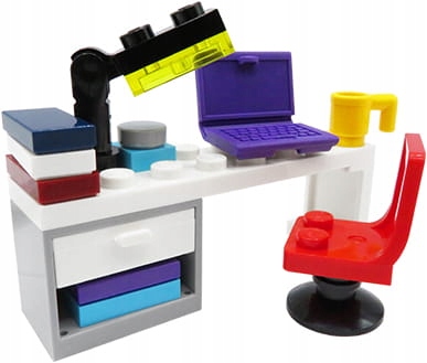 меблі / меблі: стіл + аксесуари -спеціальна модель -це 100% нової, оригінальної цегли Lego. Модель - це оригінальний проект додаткових цегли. Конструкція включає: білий та сірий стіл, фіолетовий ноутбук, червоний стілець, жовта кухоль, лампа та всі інші елементи, видно на фотографії. Модель упакована в струнну сумку. Меблі для самостійного складання відповідно до прикріплених інструкцій. Орієнтовний розмір після складання: 7 см х 3,9 см х 4,9 см