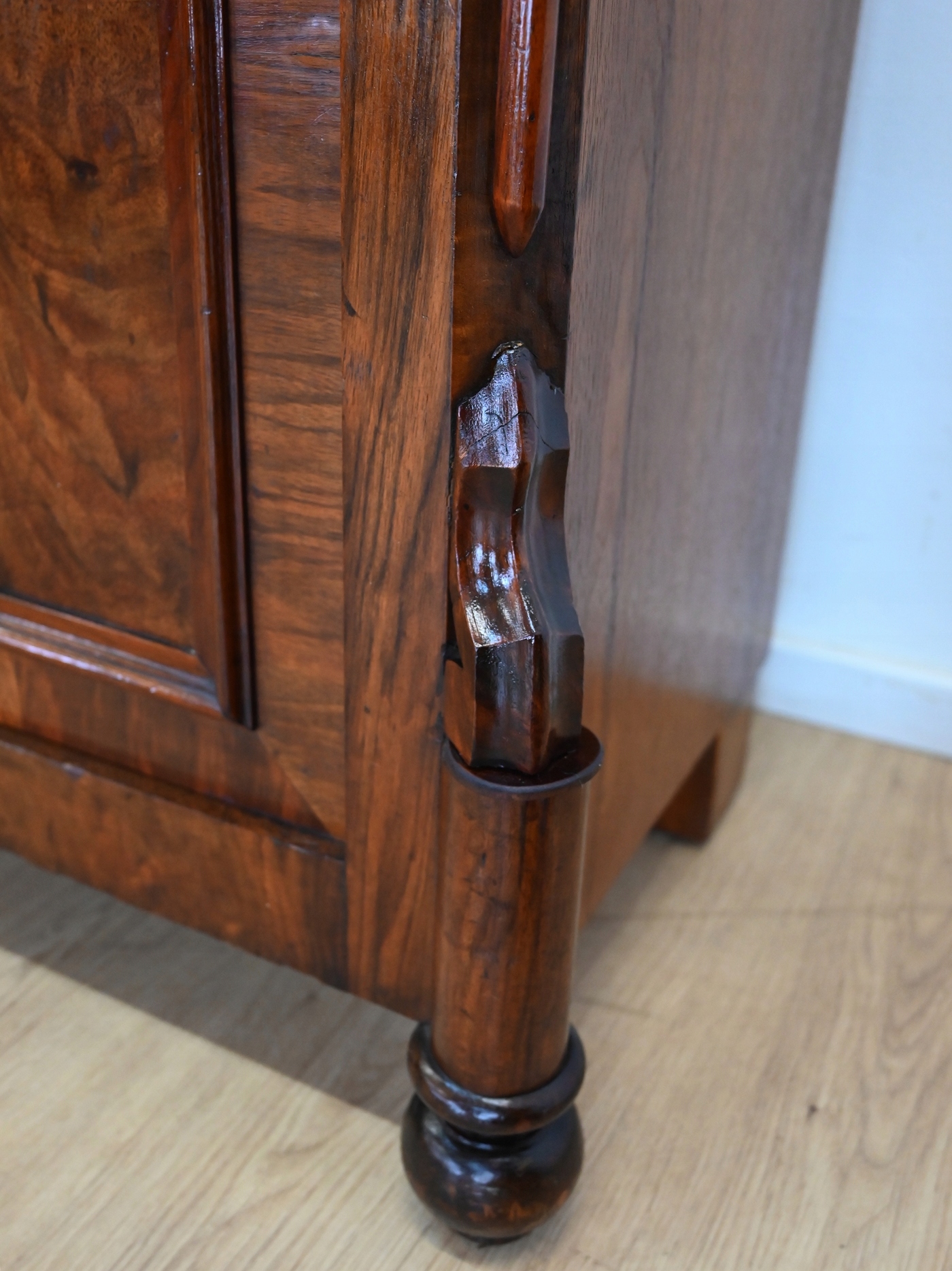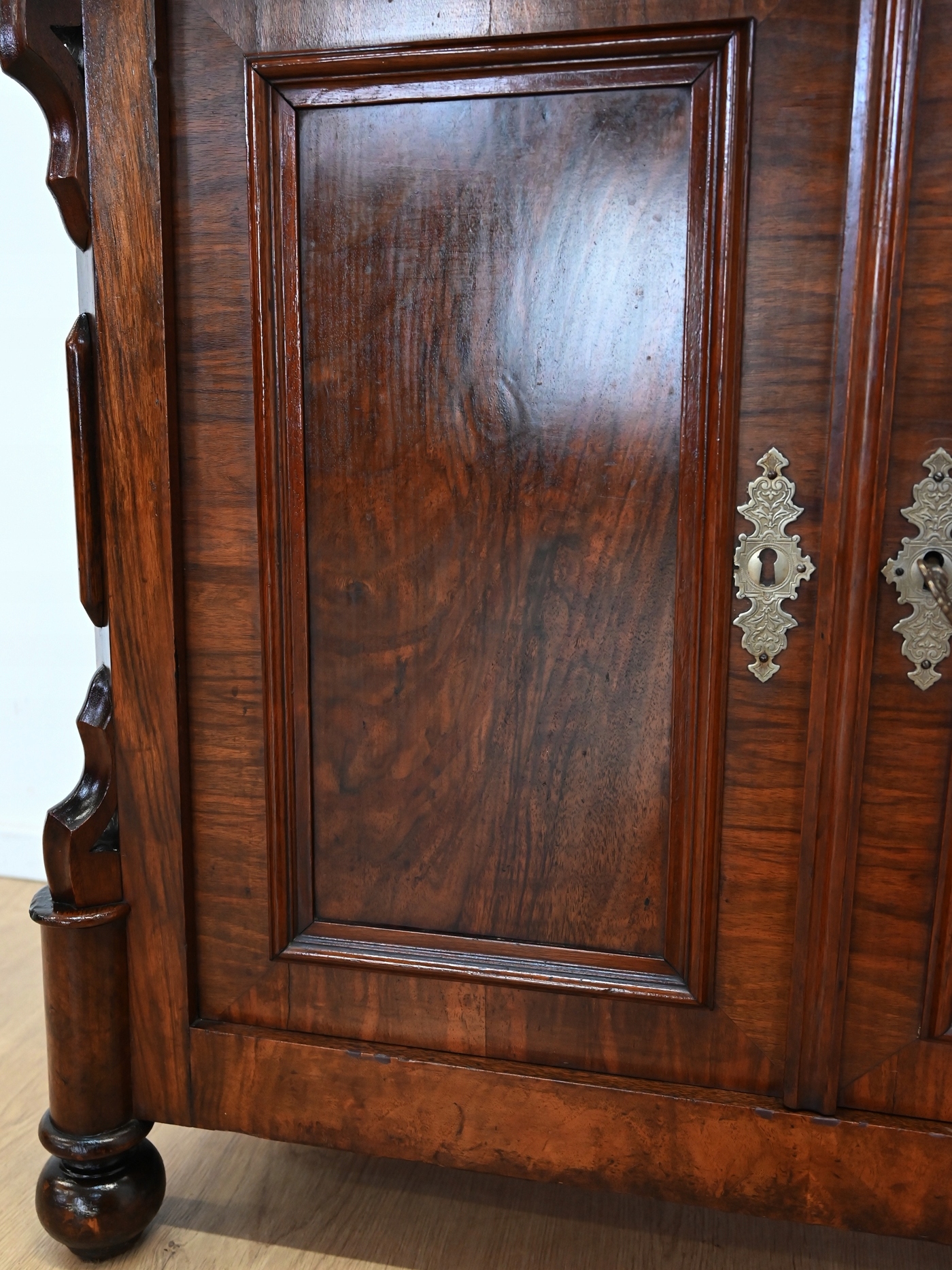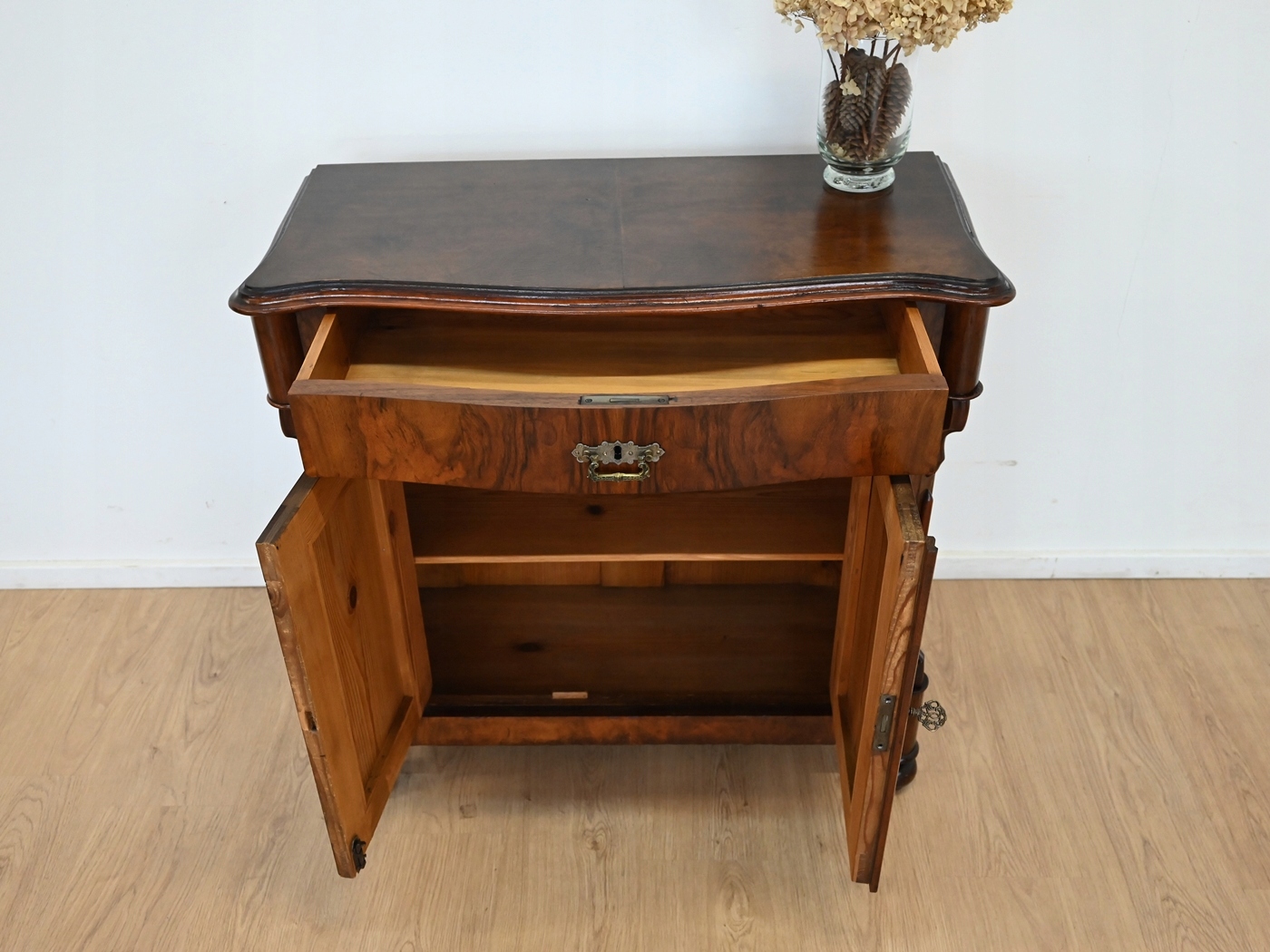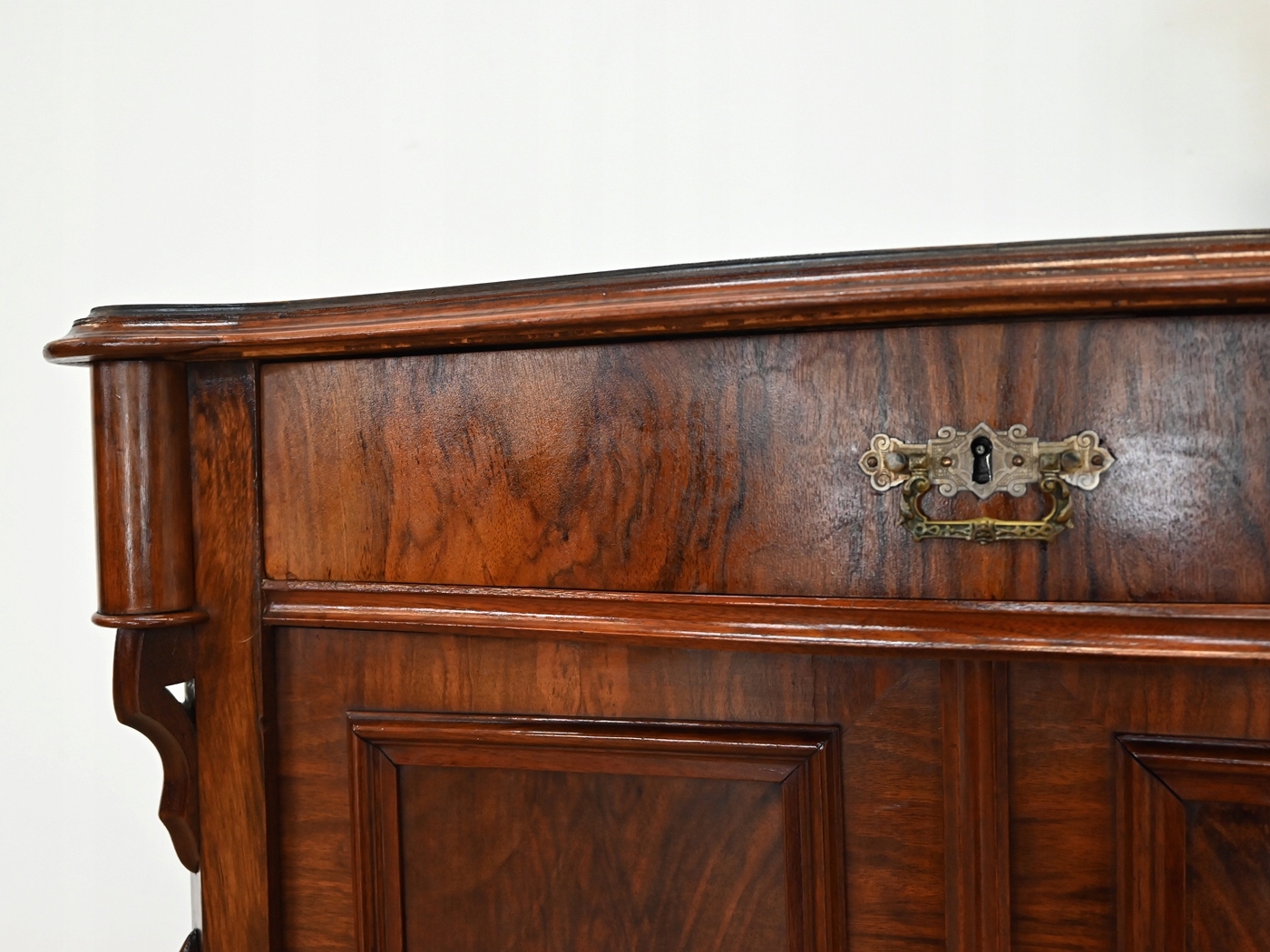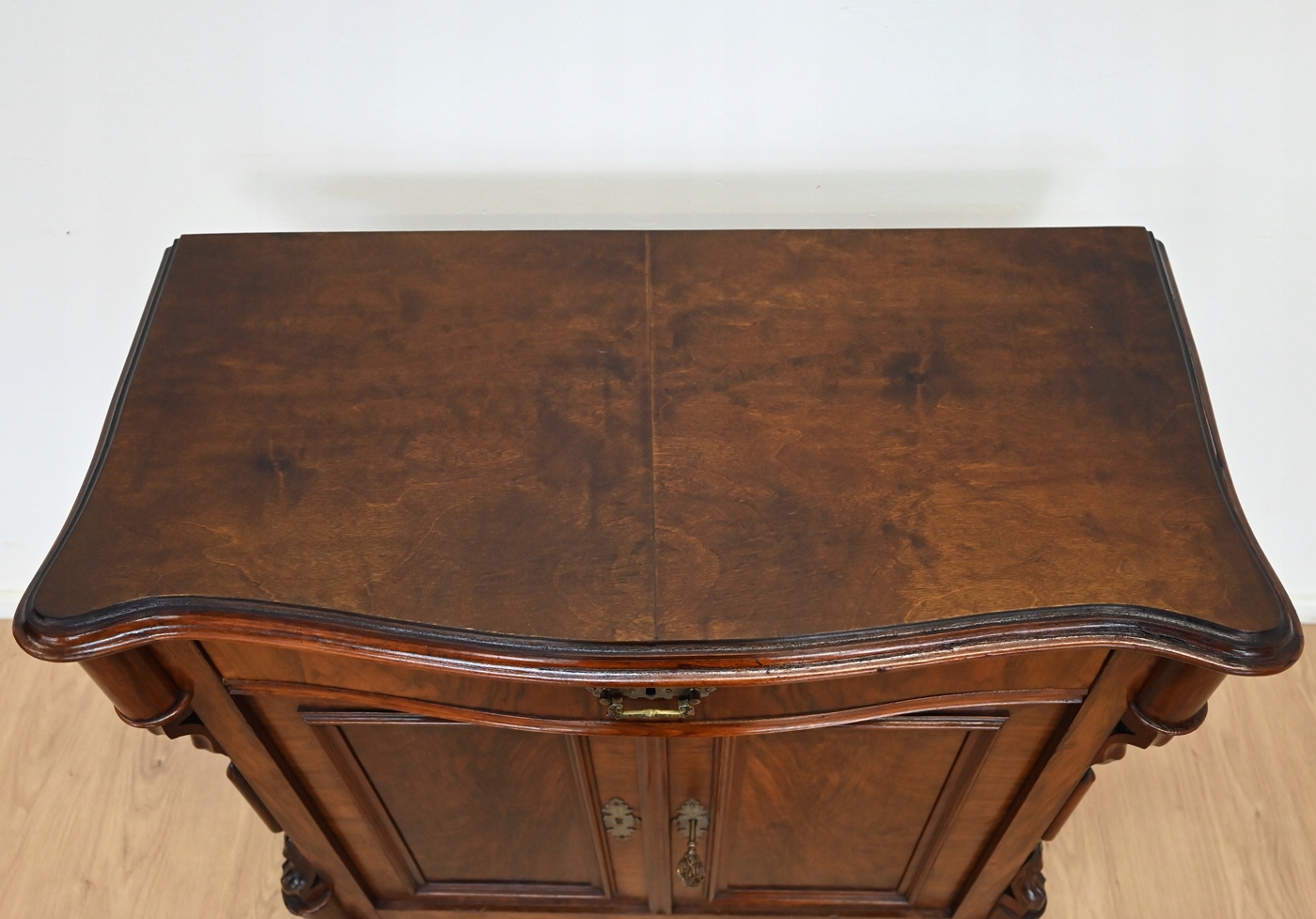 повністю виготовляється з дерева, поважного шпони. Меблі, підготовлені до використання. Зовнішні поверхні та центр меблів були оновлені. Меблі вже мають свої роки та сліди минулого часу, що не впливає на його естетичний прийом, вони є свідченням справжності меблів. Кабінет може негайно поставити в квартиру.