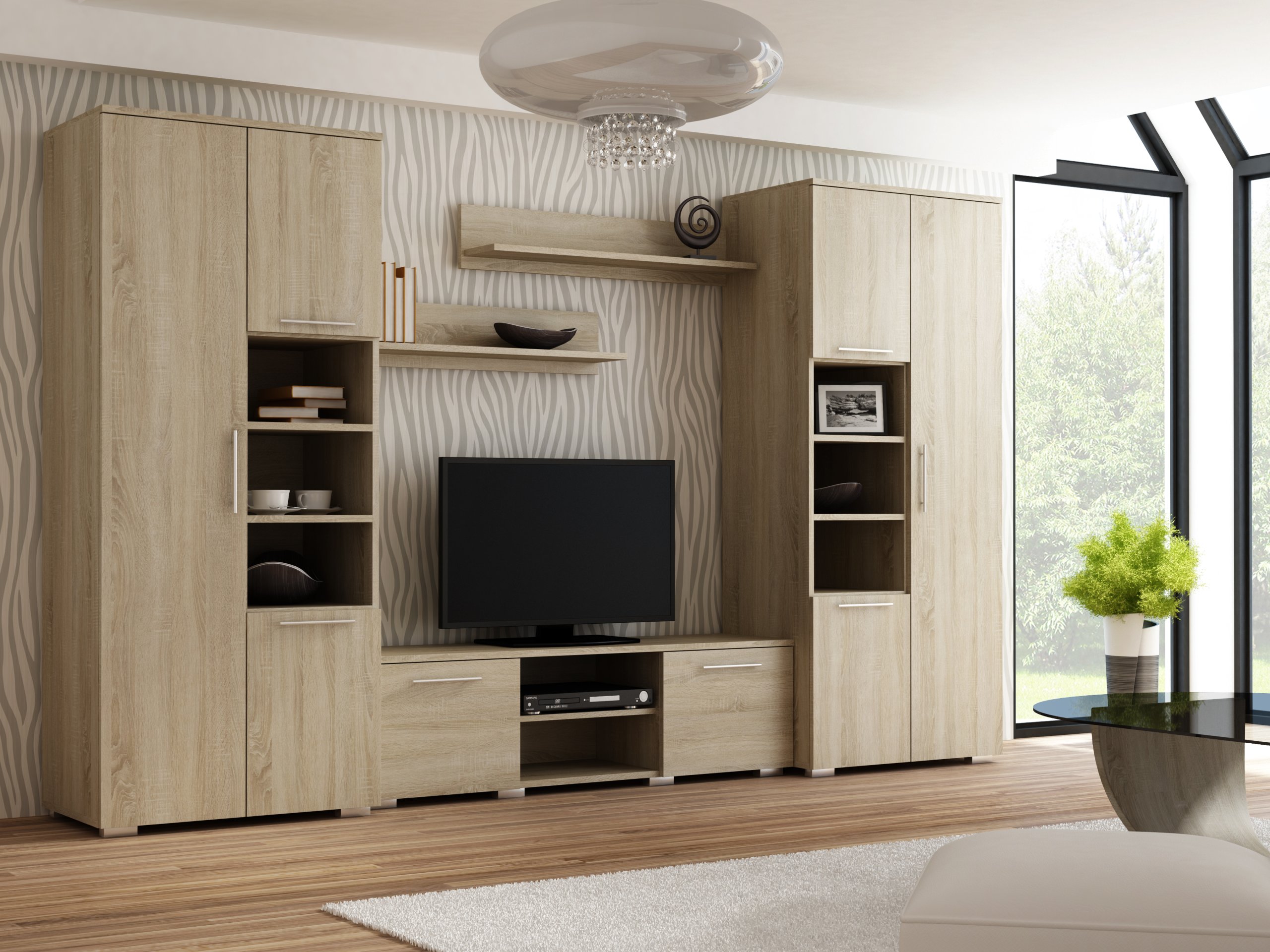 Прямі лінії та увага до деталей роблять стельку Apollo гарною для будь-якого інтер’єру. Від скандинавського клімату через мінімалізм до сучасних і дизайнерських домовленостей. Дві високі шафи забезпечують багато місця для зберігання. Комод допоможе виставити телевізійну техніку, приховавши кабелі. Підвісні полиці стануть в нагоді для дрібничок або сімейних фотографій. Такий комплект меблів буде добре виглядати як у вітальні, так і в кімнаті підлітка. Також може підійти для кімнати для гостей