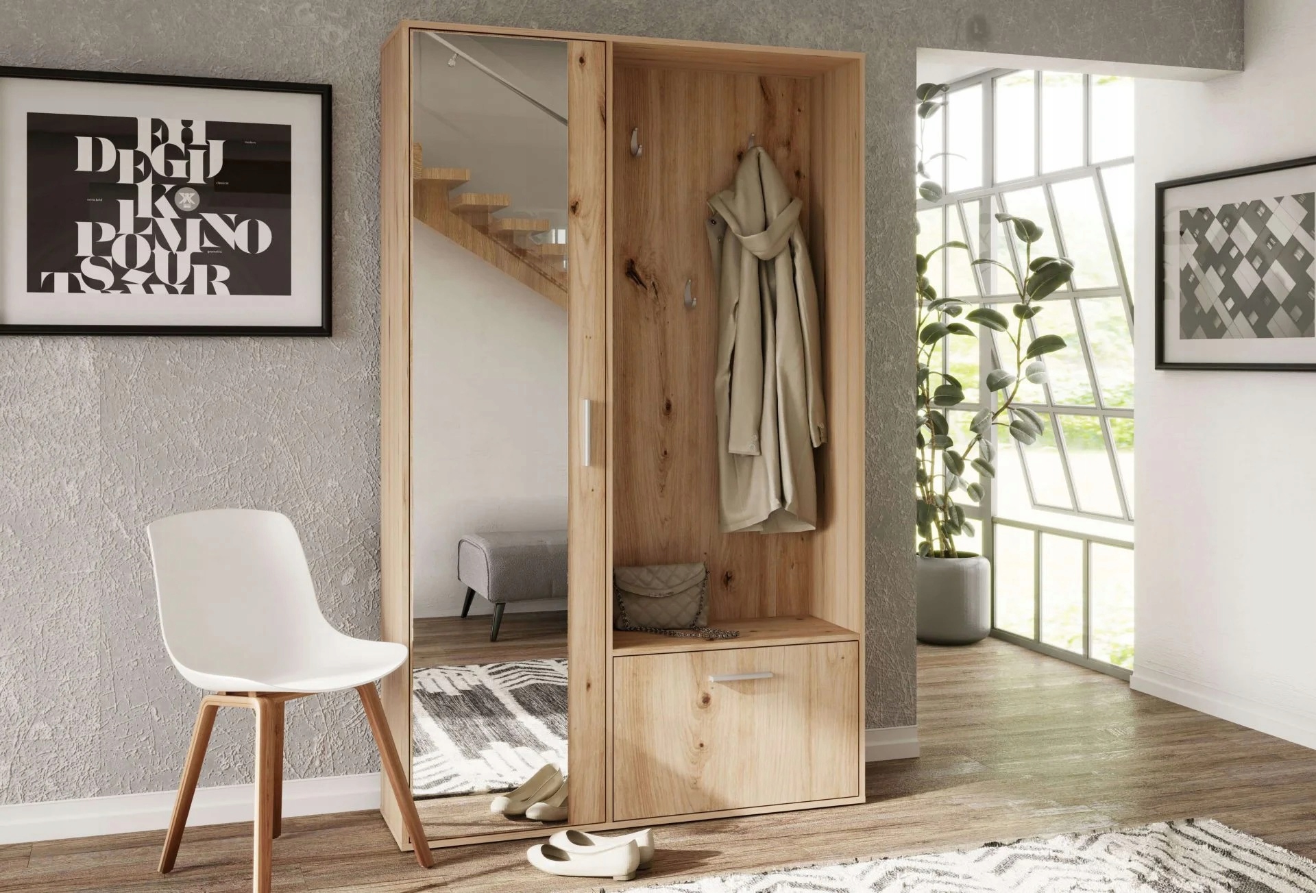 Шафа з дзеркалом і меблями BIS. Має три зовнішні вішалки, які ідеально підходять для піджаків, пальто, світшотів і сумок. Нижче розташована шафа для взуття з перегородкою, що полегшує організацію. Шафа зліва має дві полиці. Один вгору, а інший вниз, це дозволяє розмістити на них речі, які потрібно поставити на рівну поверхню. Сучасним варіантом є висувна вішалка, яка підкреслює унікальність і функціональність гардеробу.
