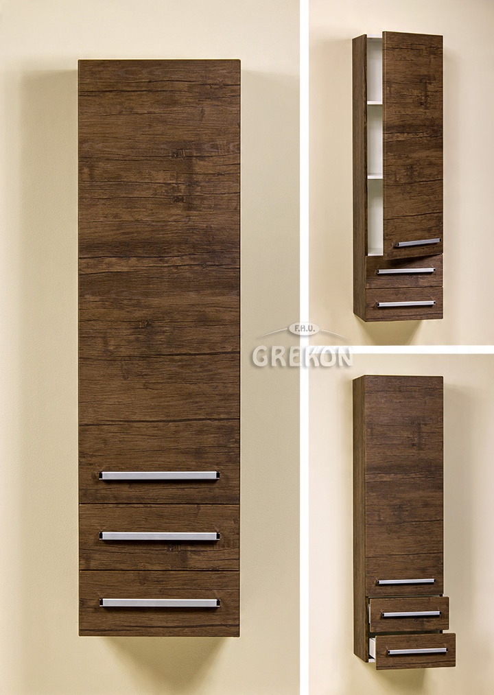 Ексклюзивна висока підвісна полиця для ванної кімнати кольору старовинного дерева з серії FOKUS. Книжкова шафа має дві шухляди та дверцята.