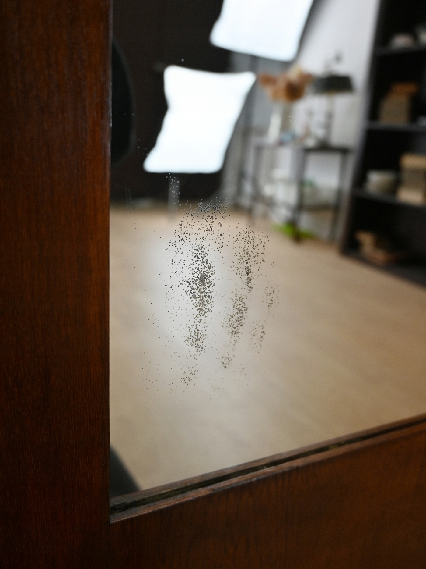 Дзеркало з дрібними подряпинами та патиною в лівому нижньому кутку.