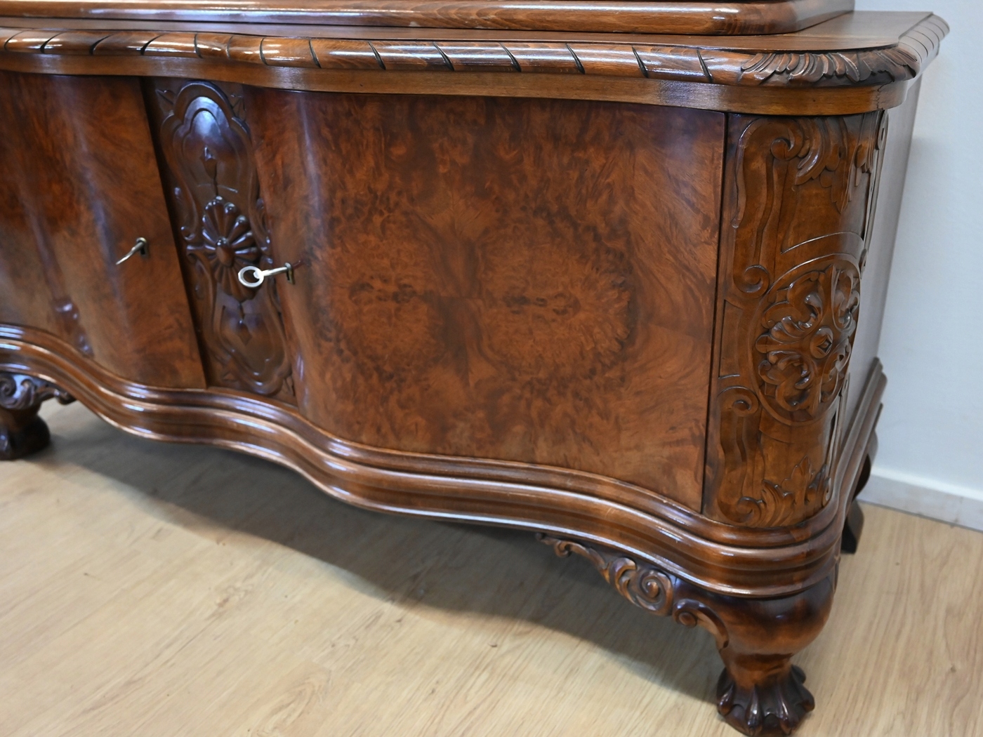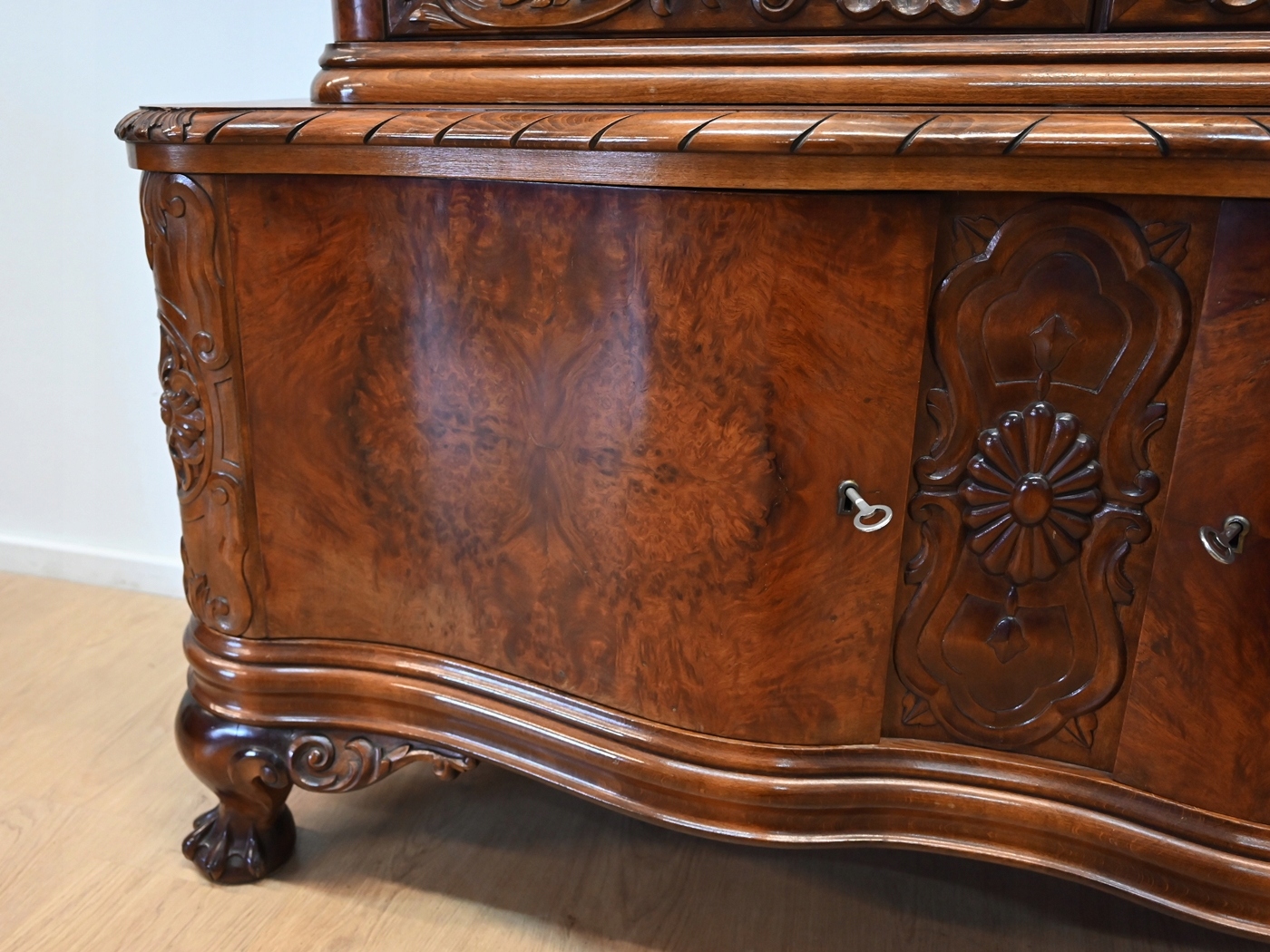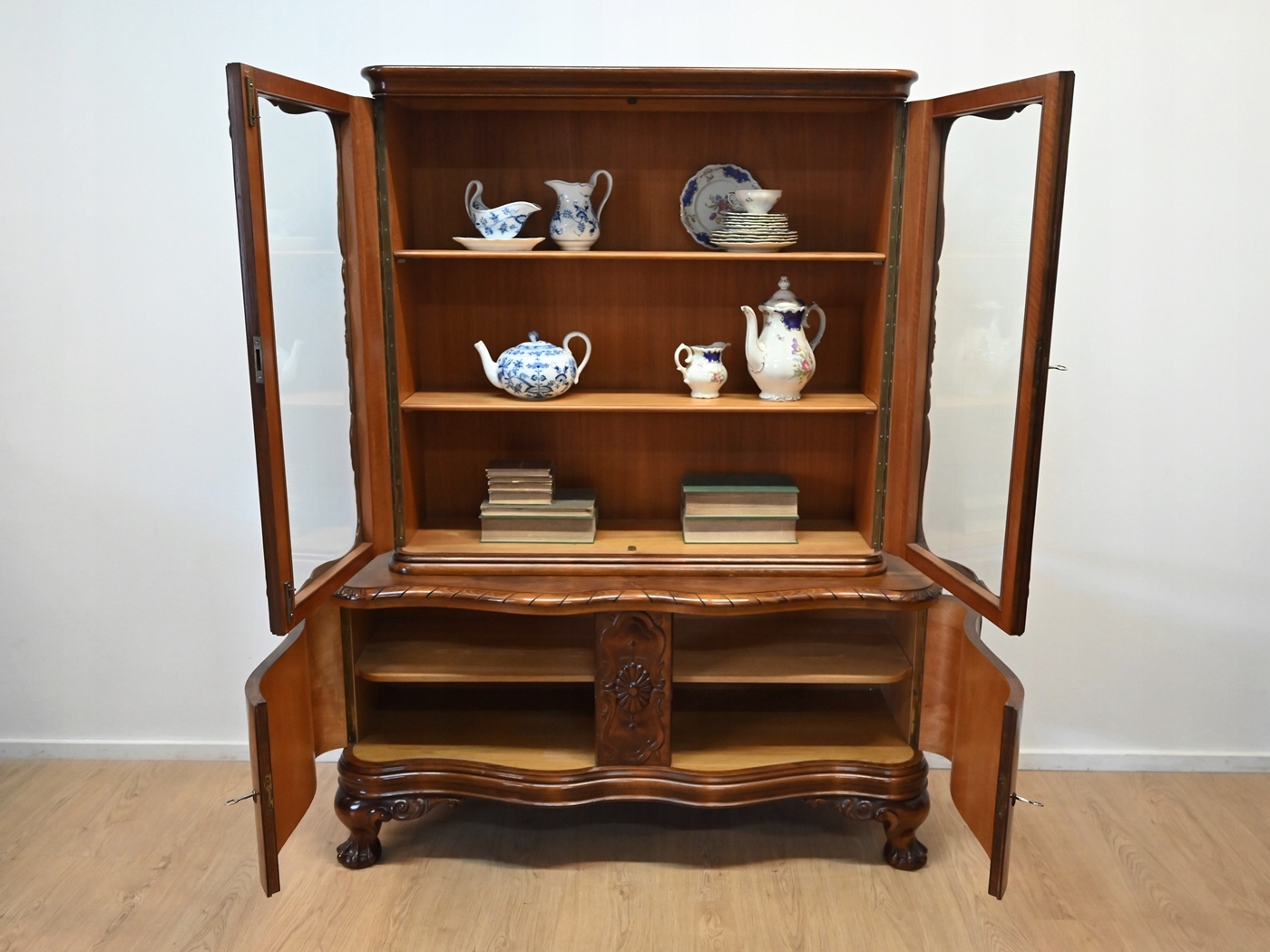 Дуже хороший стан. Меблі готові до використання. Оновлено зовнішні поверхні та інтер’єр меблів. Меблі вже старі, а сліди минулого, які не впливають на їх естетичне сприйняття, є доказом автентичності меблів. Вітрину можна відразу поставити в квартиру.
