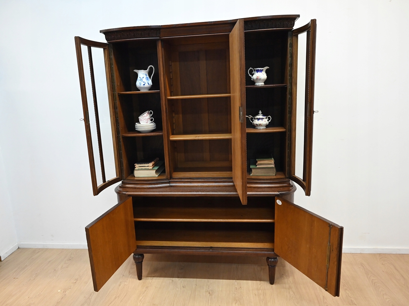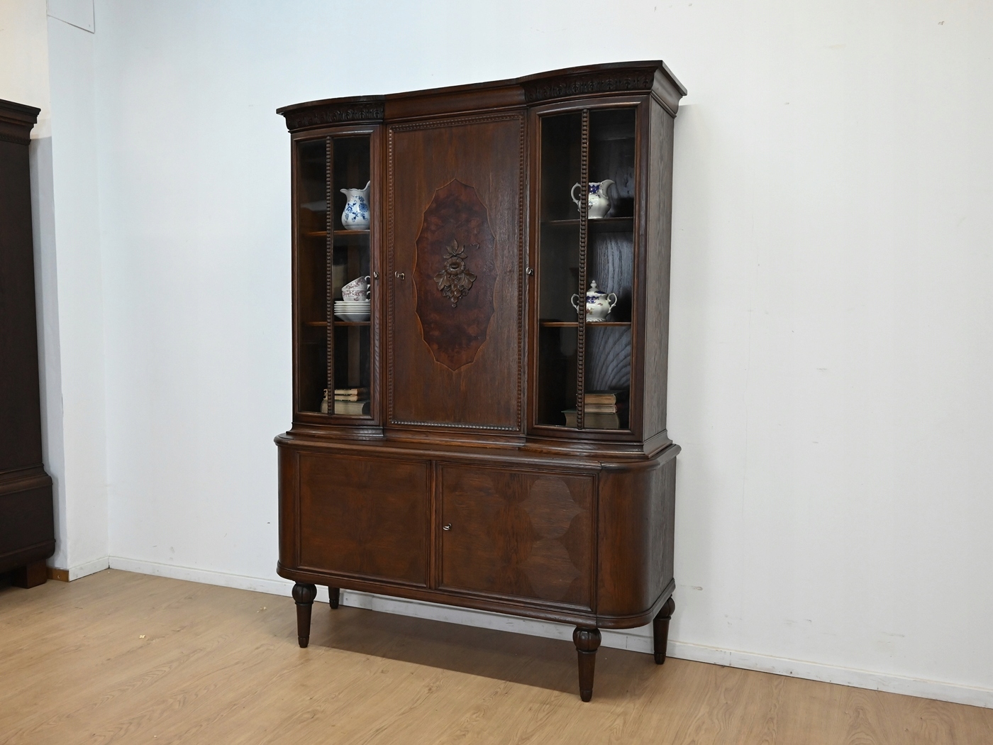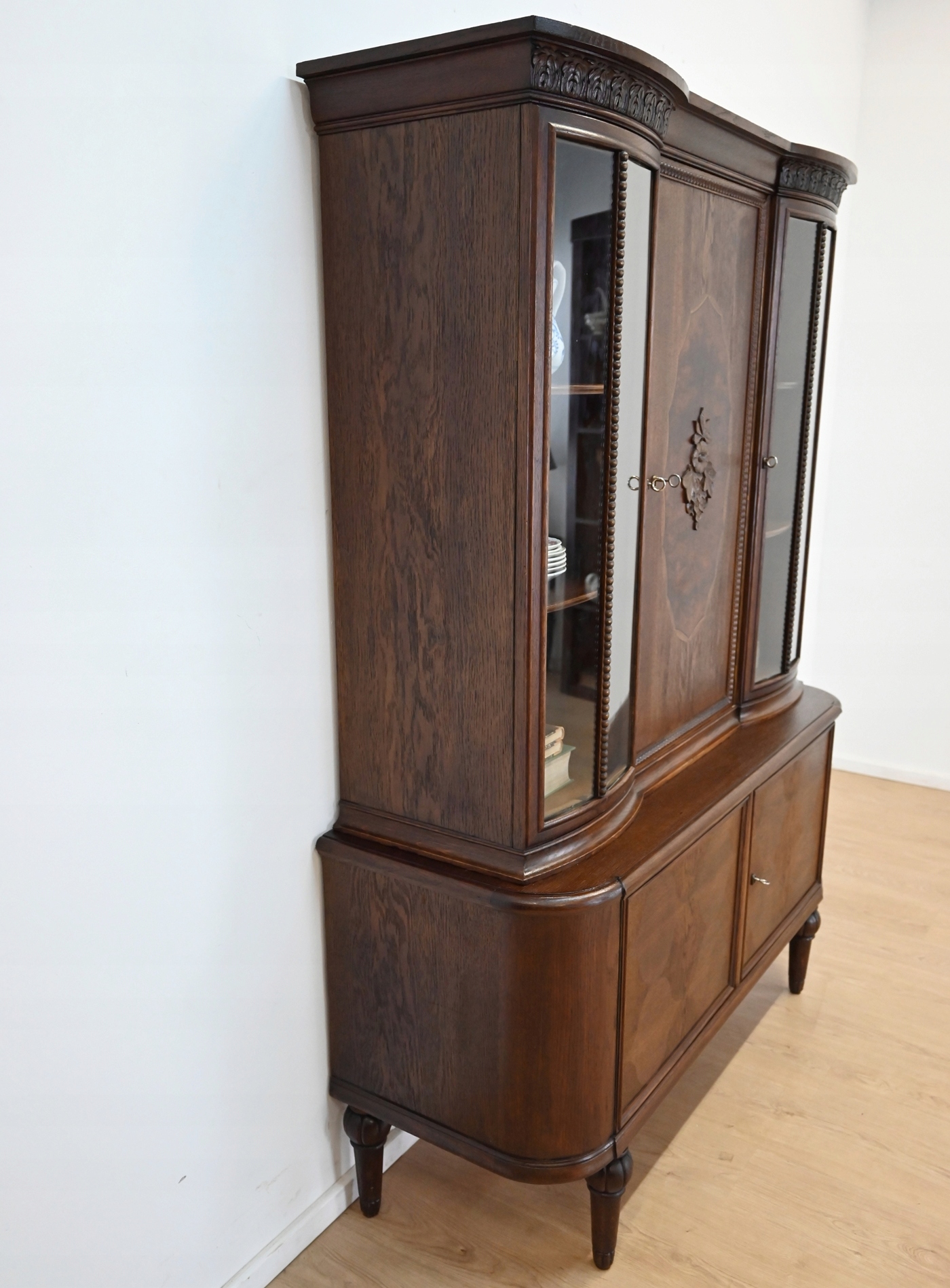 Дуже хороший стан. Меблі готові до використання. Оновлено зовнішні поверхні та інтер’єр меблів. Меблі вже старі, а сліди минулого, які не впливають на їх естетичне сприйняття, є доказом автентичності меблів. Вітрину можна відразу поставити в квартиру.