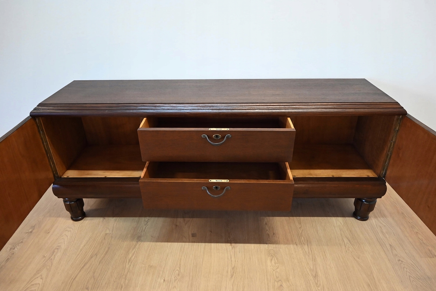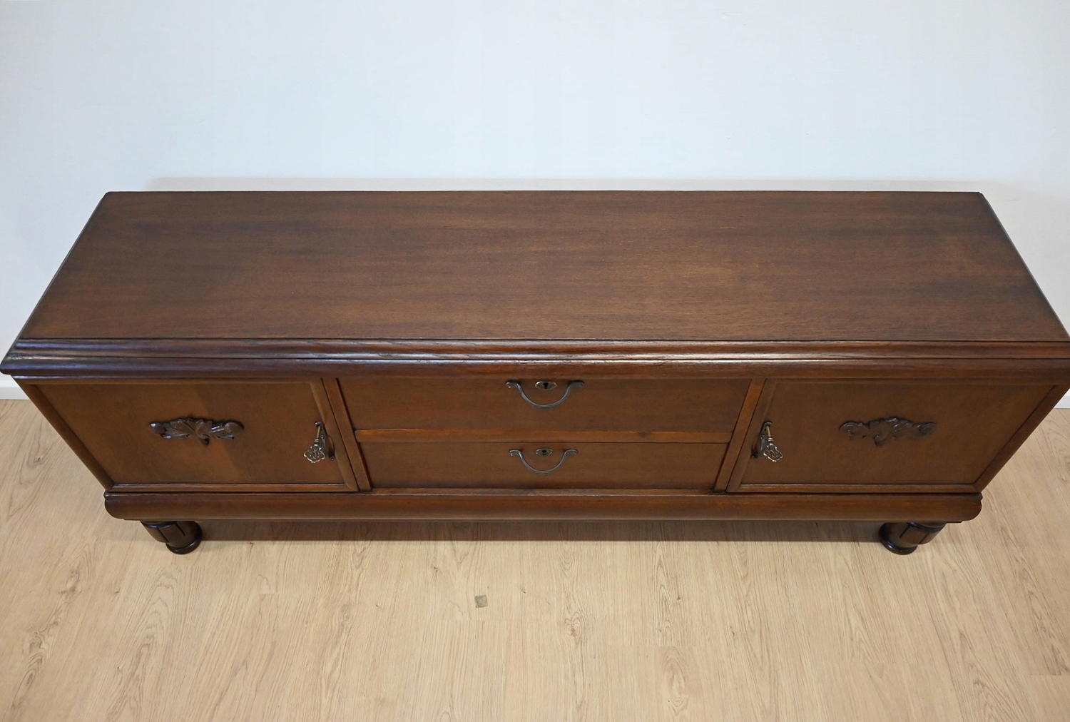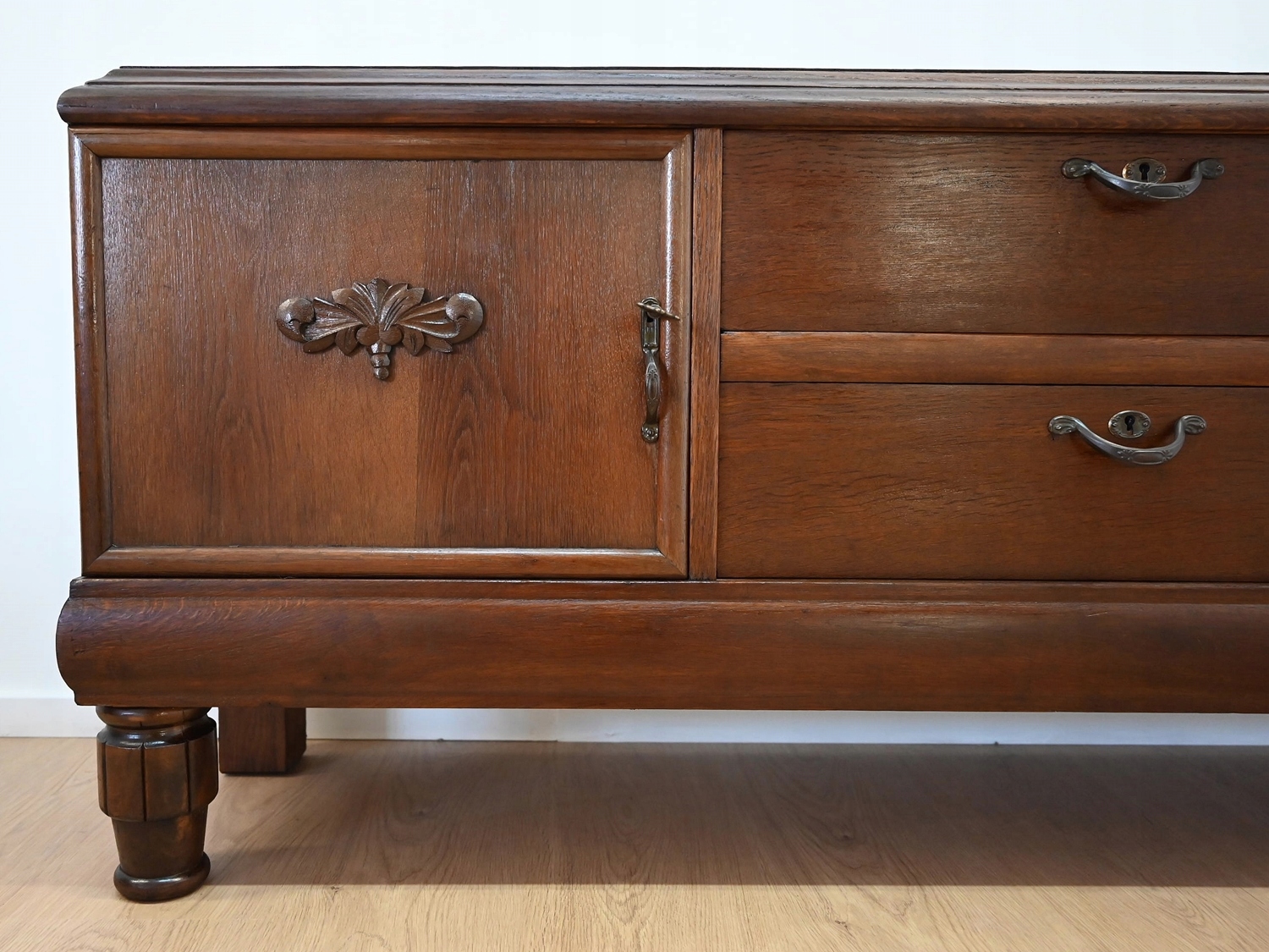 Низька довга шафа з ящиками та високими ніжками з оригінальною фурнітурою.