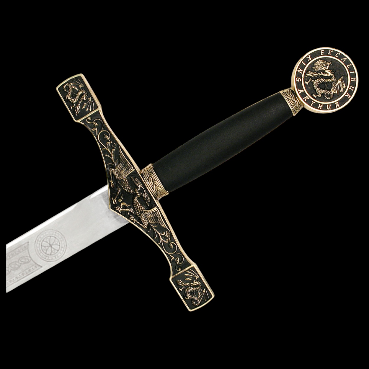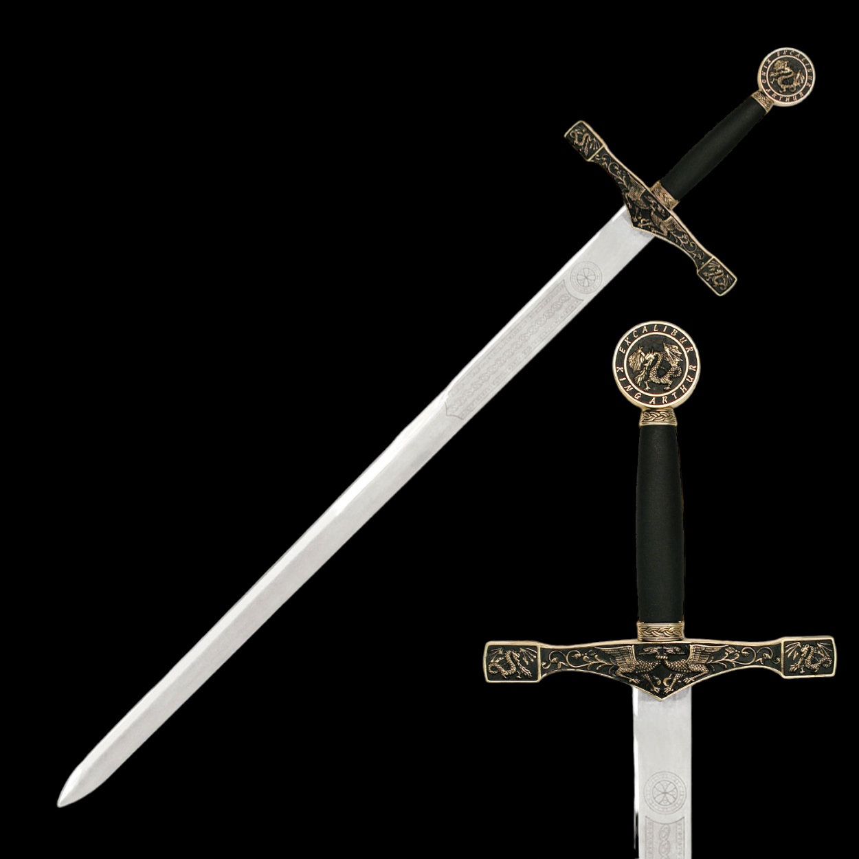 Кругла голова із зображенням дракона та написом навколо нього - король Артур Екскалібур.