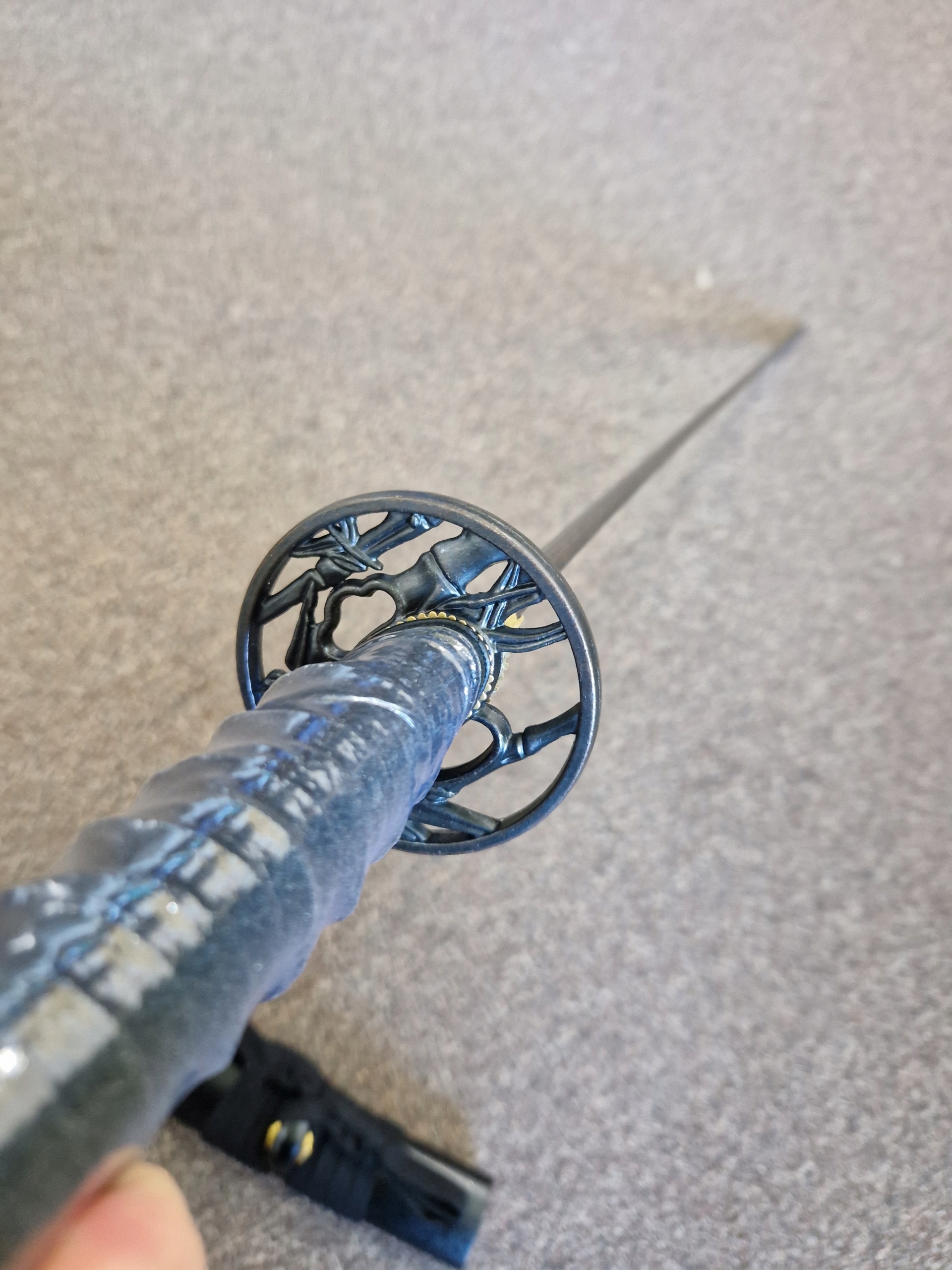 Клинок зі сталі 1065. Дерев'яна рукоятка, двостороння, покрита світлою шкірою ската і переплетена струною для кращого захоплення. Цуба (кругла хрестовина) кована з міді.