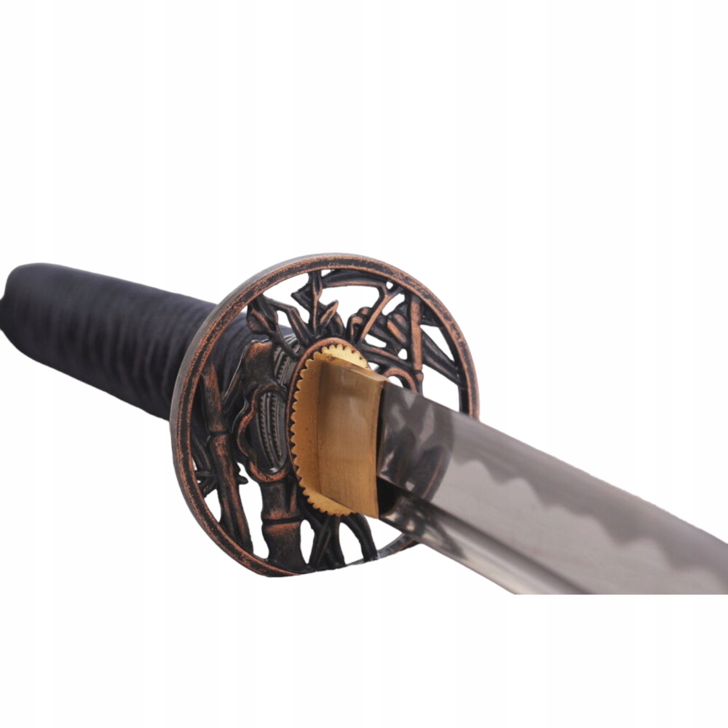 Клинок зі сталі 1065. Дерев'яна рукоятка, двостороння, вкрита світлою шкірою ската та переплетена струною для кращого захоплення. Цуба (кругла поперечина), кована з міді.