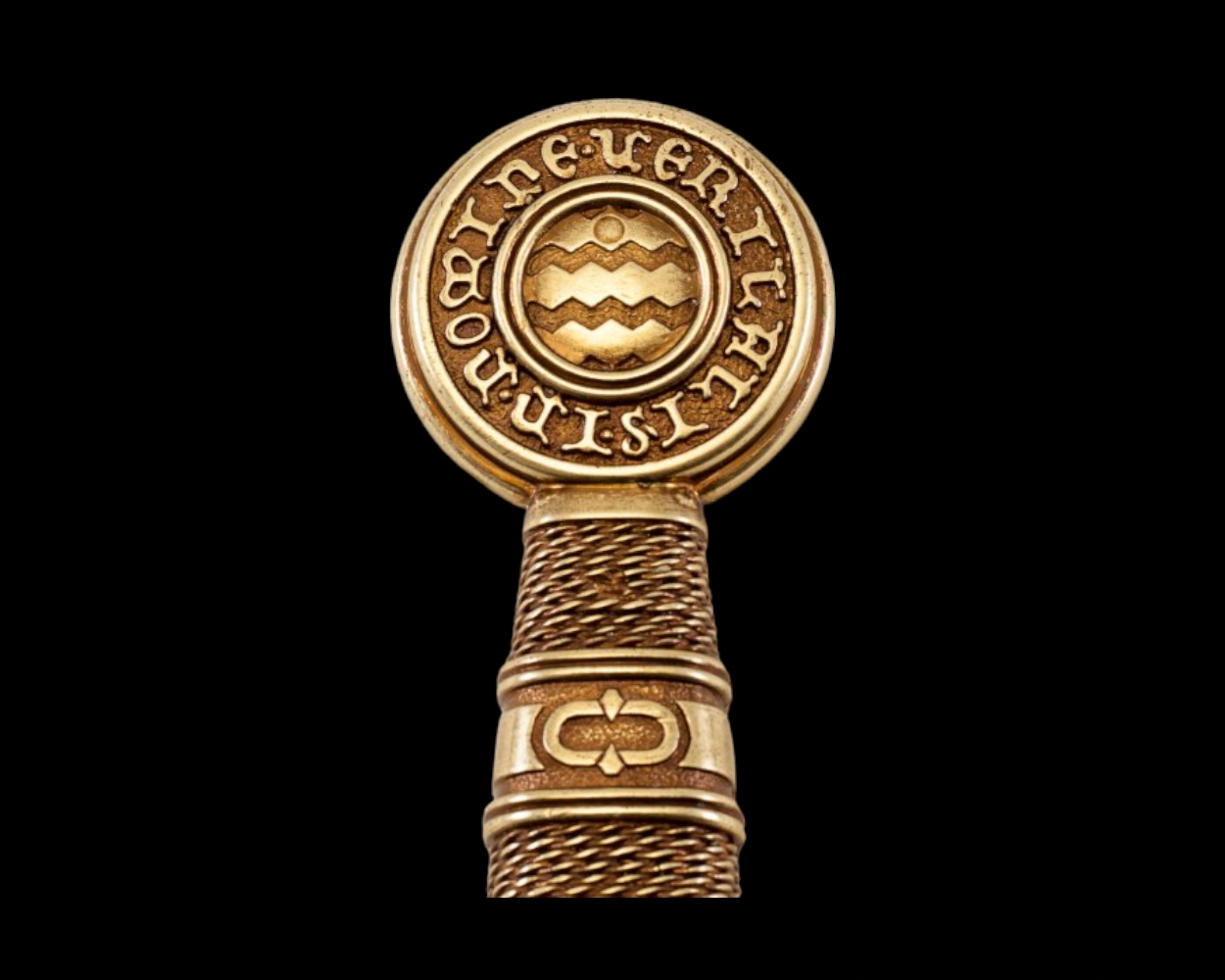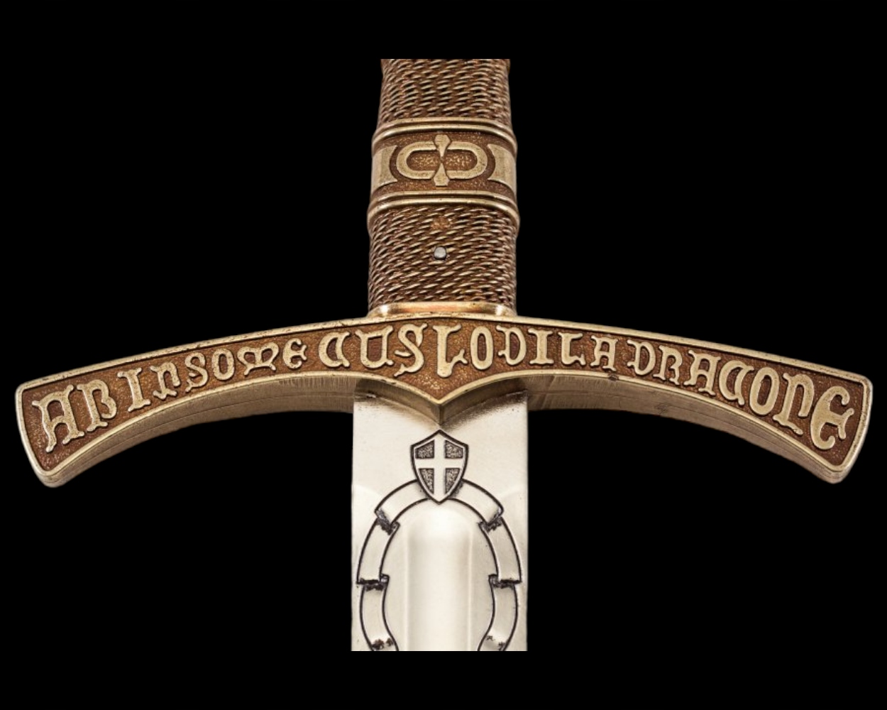 Латинський напис на хрестовині та наверші: Тримається драконом, який не спить, і в ім’я правди