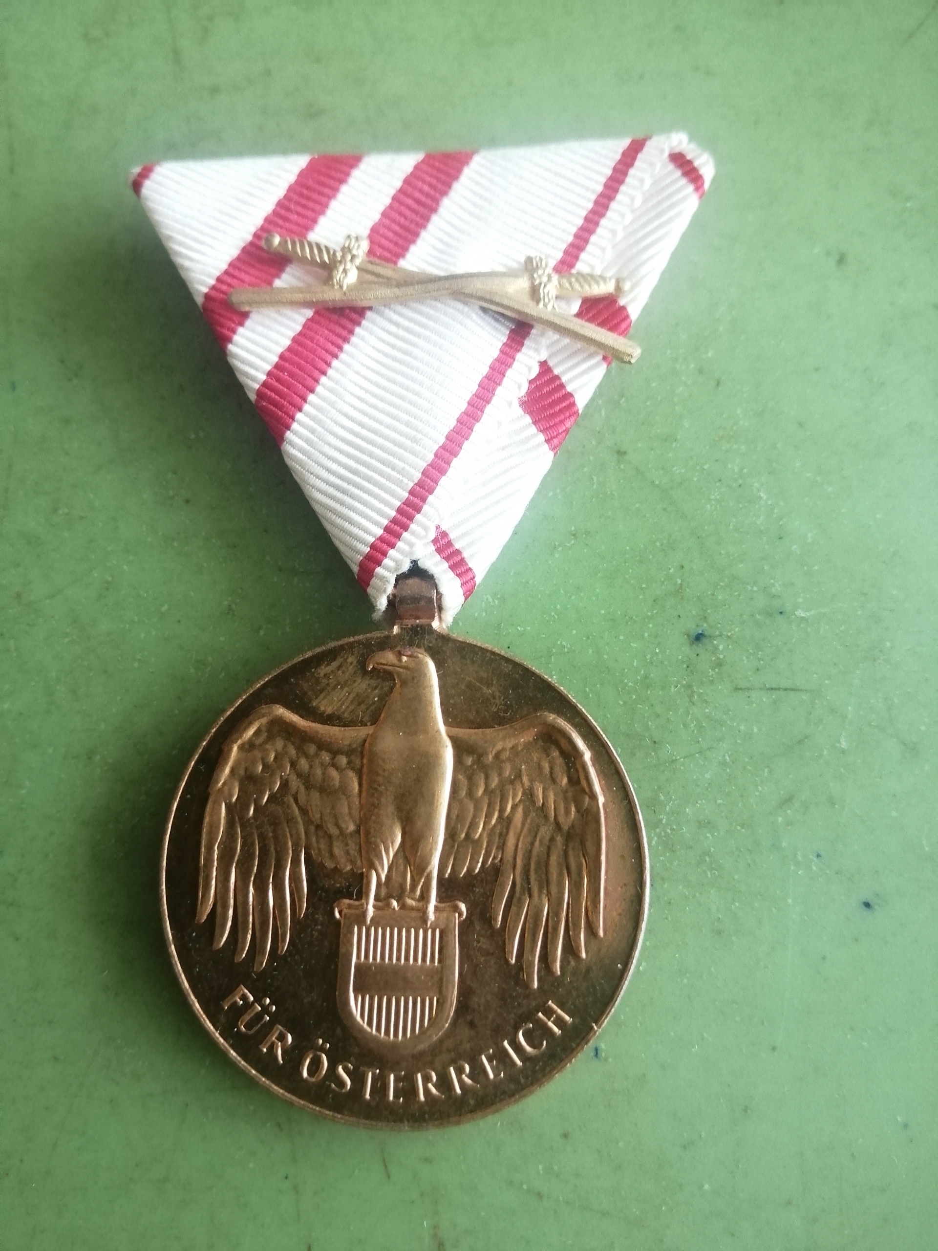 Я рекомендую пам’ятну австрійську військову медаль, засновану в 1933 році Першою Австрійською Республікою. Медаль нагороджена ветеранами Першої світової війни. Діаметр 33 мм. На лицьовій стороні зображено орла, що вінчає герб із фесом із зображенням спрощених гербів Австрії, під орлом напис: FUR OSTERREICH. На реверсі медалі напис: 1914 - 1918 в оточенні вінка з дубового листя на стрічці. Дуже гарний стан!
