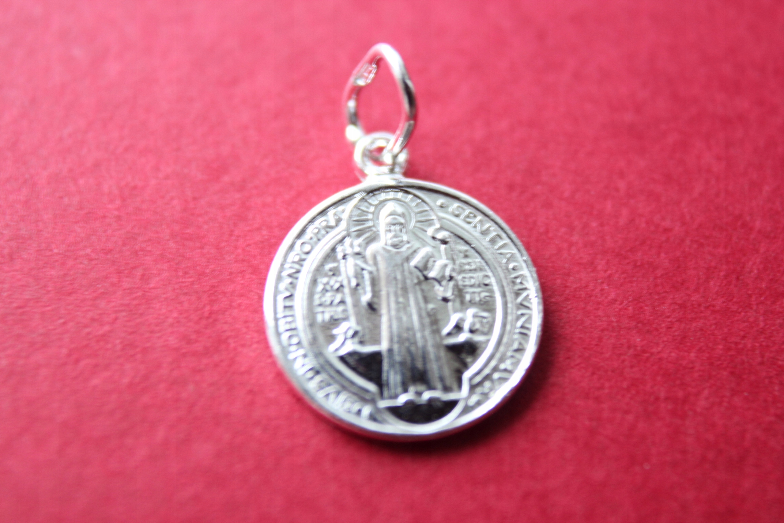 Маленький срібний медальйон із зображенням святого Бенедикта.
